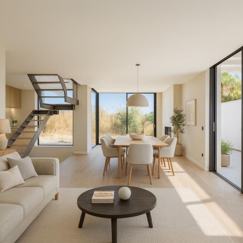 En soldränkt terrass löper längs husets sydsida och erbjuder flera lounge- och matplatser. En uppvärmd pool, ett stilfullt utekök med grill och flera chill-out-zoner skapar den perfekta miljön för att njuta av det mediterrana livet.