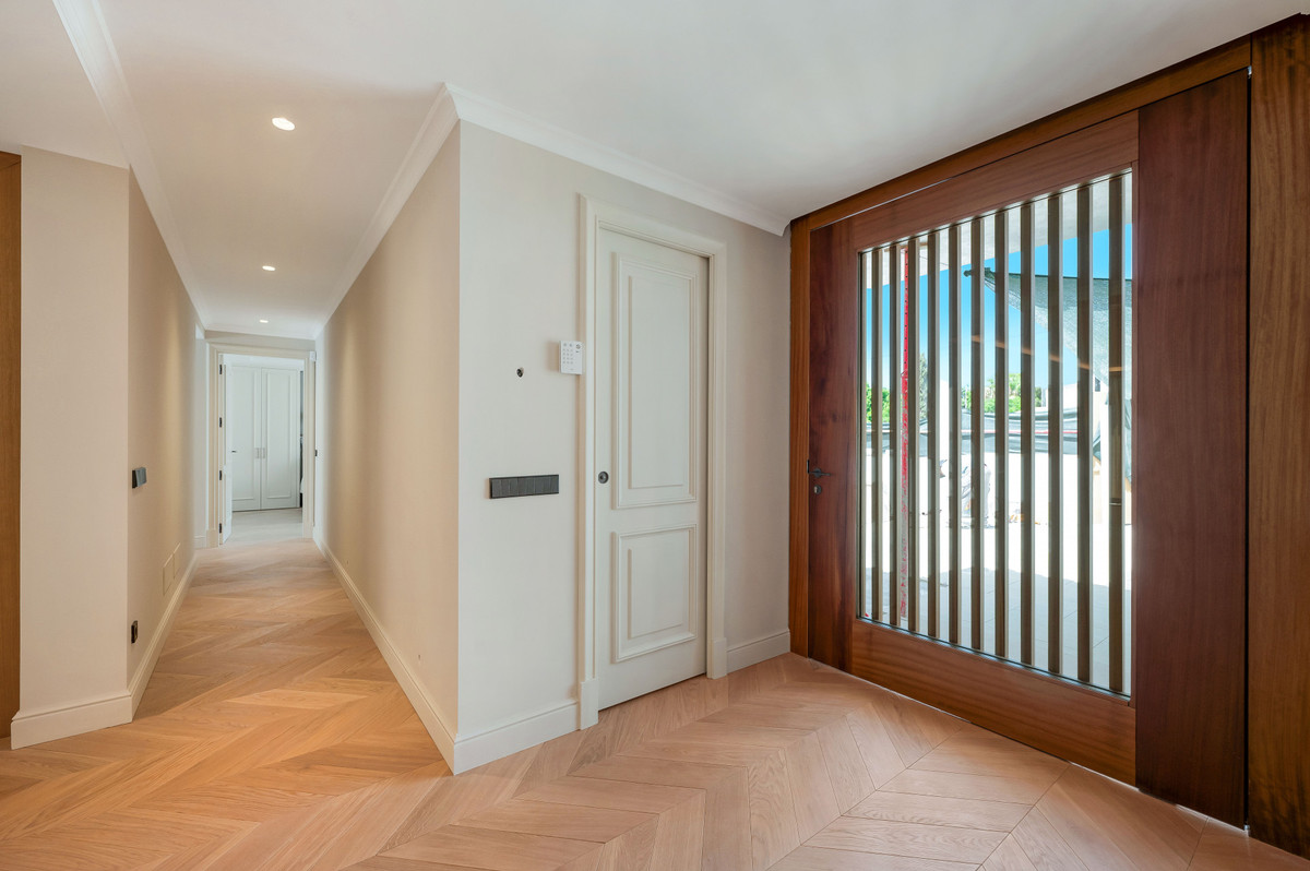 Offering approximately 270 sqm of refined interior living space, complemented by nearly 200 sqm of terraces, including a sundeck with green and sea views, this villa is thoughtfully designed for comfortable family living and sophisticated outdoor entertaining. The main floor features a bright and open-plan layout that seamlessly connects the kitchen, dining, and living areas. The interiors are styled in a neutral palette with elegant wood accents, creating a harmonious blend of modern design and natural warmth. Floor-to-ceiling glass panels on both façades flood the space with natural light and provide a striking line of sight from the entrance hall through to the terrace and beyond.