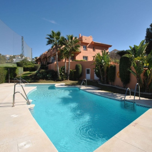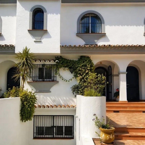 Town House for sale in Cabopino, Marbella with 2 bedrooms, 2 bathrooms, 2 en suite bathrooms and 1 toilet, with communal swimming pool and private garden. Regarding property dimensions, it has 123 m² built, 175 m² plot and 30 m² terrace. Has the following facilities amenities near, air conditioning, fireplace, guest toilet, private terrace, sea view, covered terrace, panoramic view, unfurnished, close to sea / beach, close to golf, uncovered terrace, glass doors, balcony, renovation needed and close to shops.