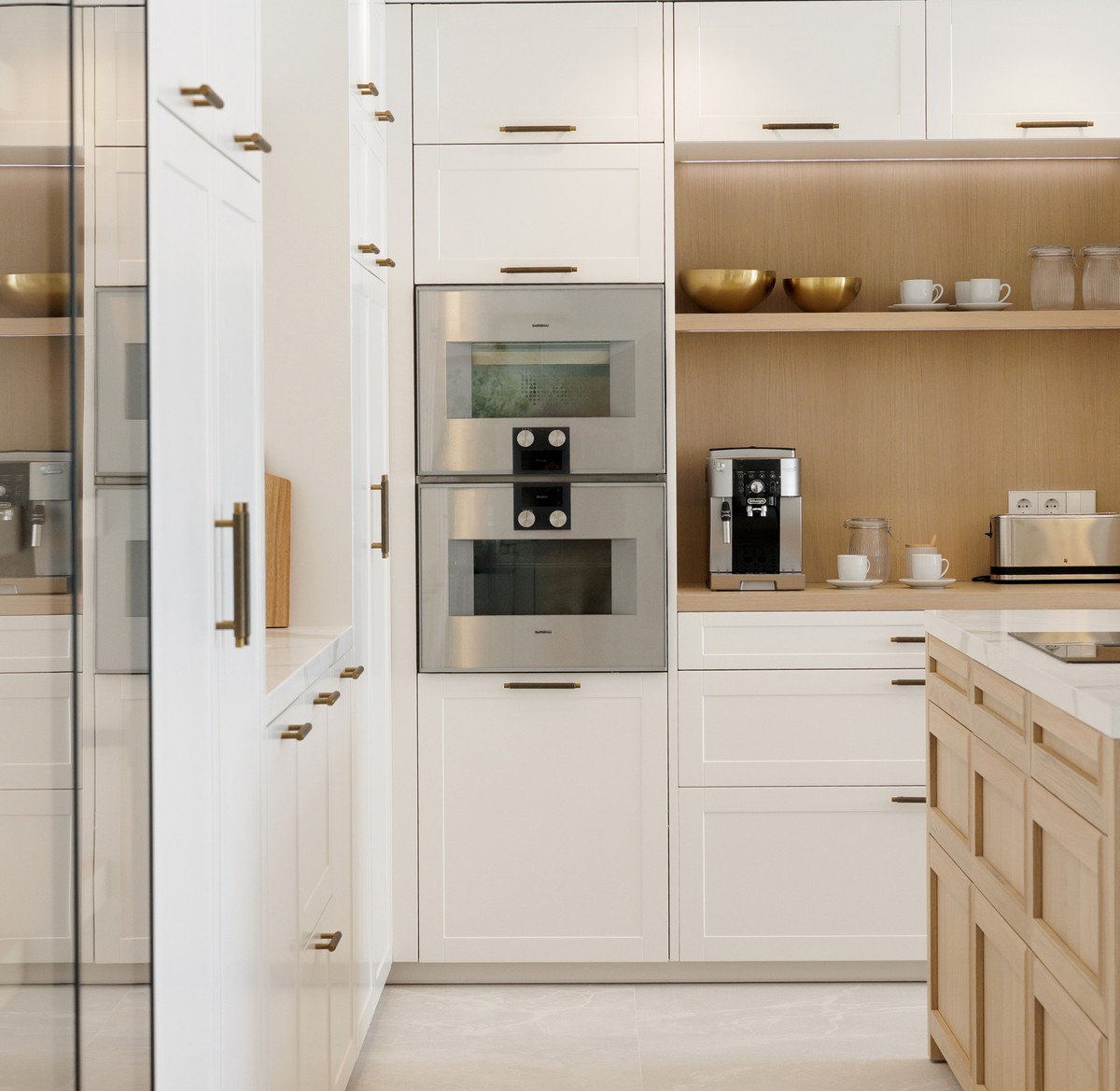 The kitchen is a key highlight of the property. Designed with clean lines and premium materials, it includes a large central island, built-in appliances, and abundant storage concealed within tailored cabinetry. The layout encourages interaction, with direct views toward the living room and seamless access to the exterior terraces and pool. This combination of layout and design makes the main floor one of the home's strongest assets.