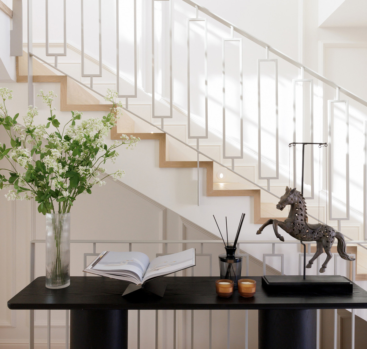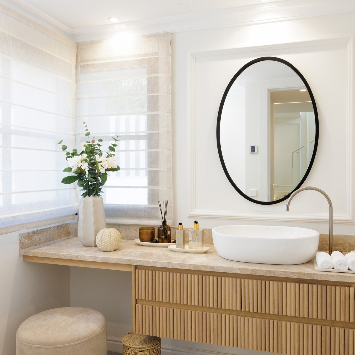 The property offers five well-appointed bedrooms, including a private primary suite on the upper floor with direct terrace access. Each room follows the same design standard—neutral tones, bespoke carpentry, and thoughtful lighting. The upper level also opens to extensive outdoor areas that capture views across the coastline.