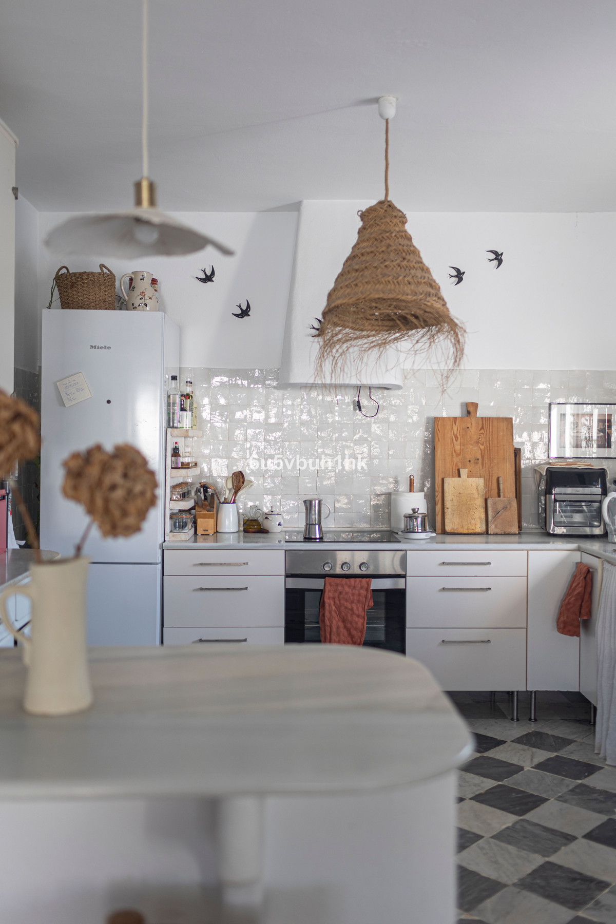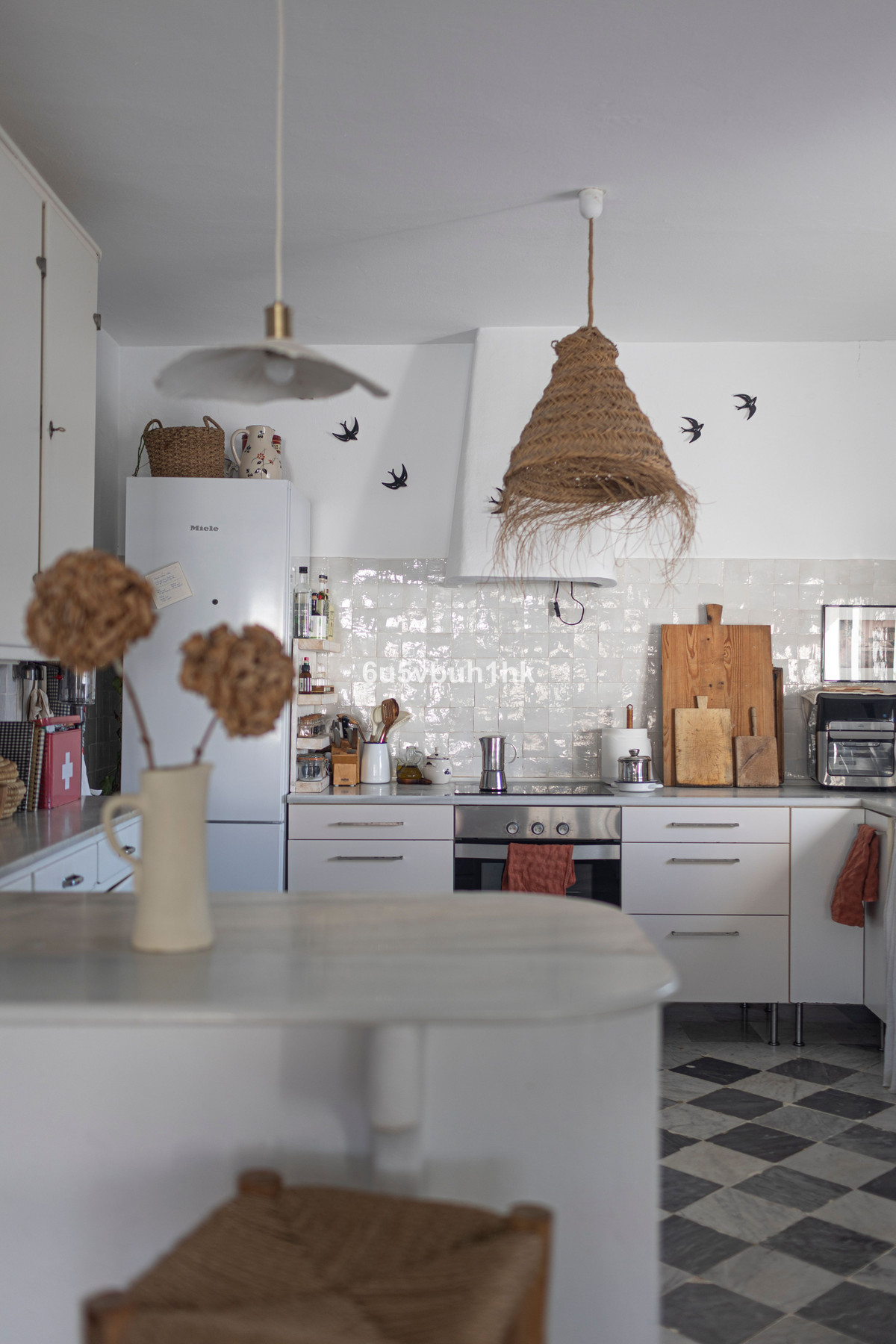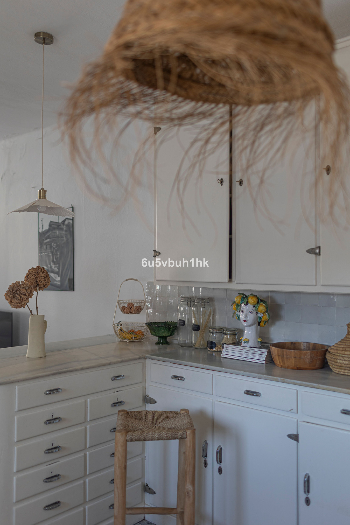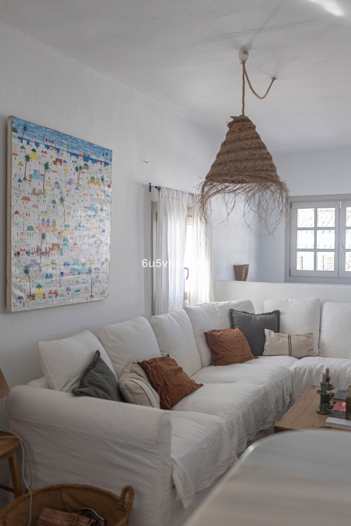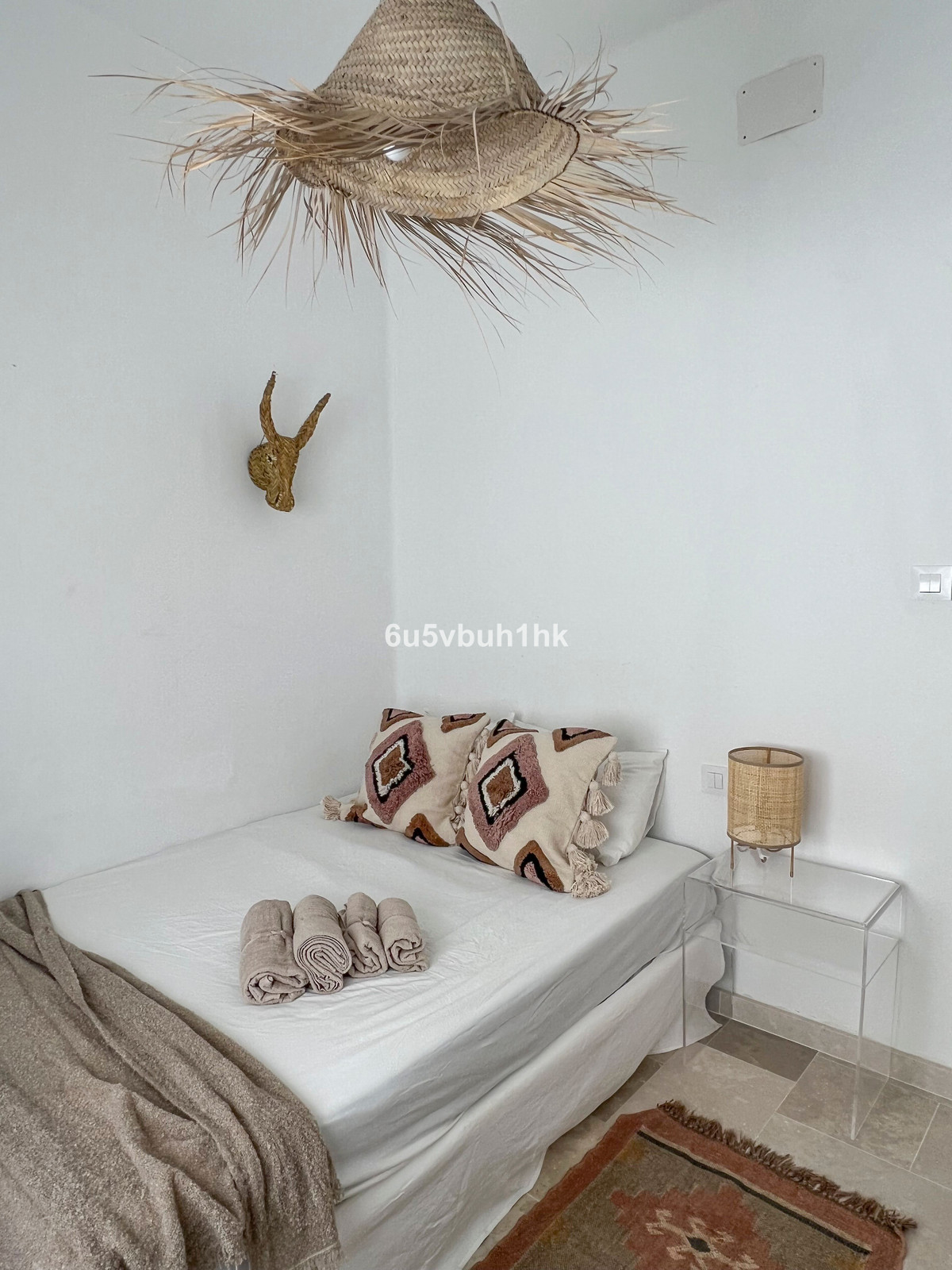 Natural materials throughout: rattan, linen, wood, and terracotta for a warm and organic feel