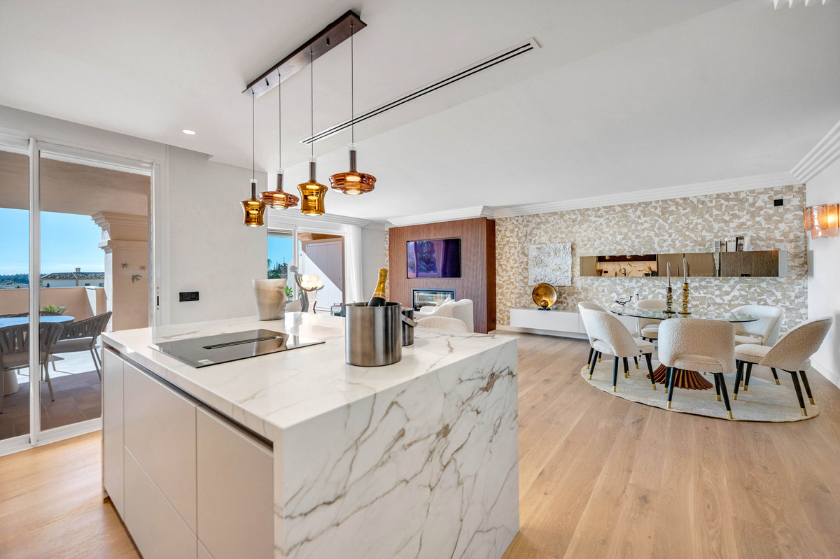 The wrap around terrace itself is a standout feature: perfect for al fresco dining, relaxing, and enjoying a charming additional sitting niche all while taking in breathtaking panoramic views across Las Brisas and Los Naranjos golf courses, the Mediterranean Sea, Gibraltar, and even the distant Atlas Mountains of Africa.