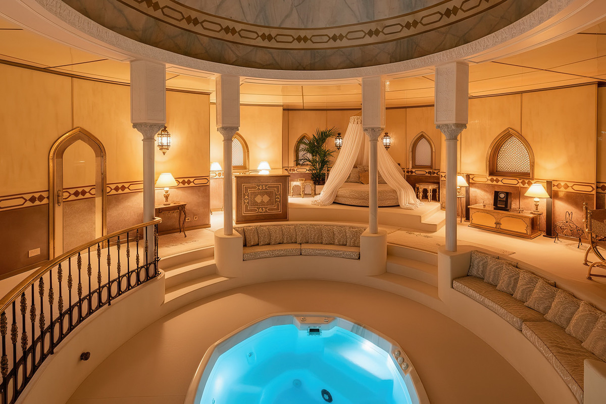 The ground floor houses the main living and reception areas, with spacious lounges and a formal dining room arranged around a central patio with a fountain, which floods the interior spaces with light and freshness.