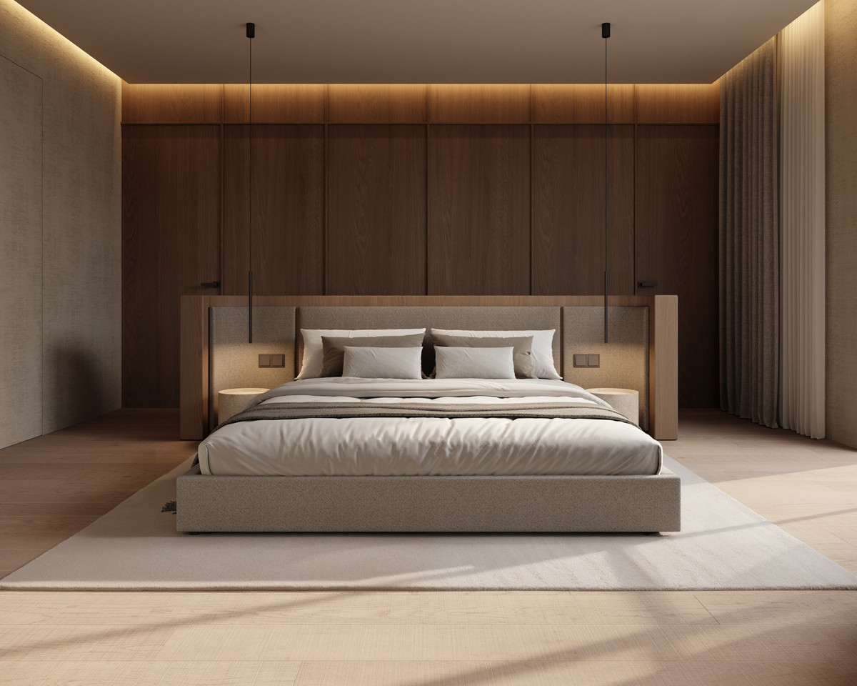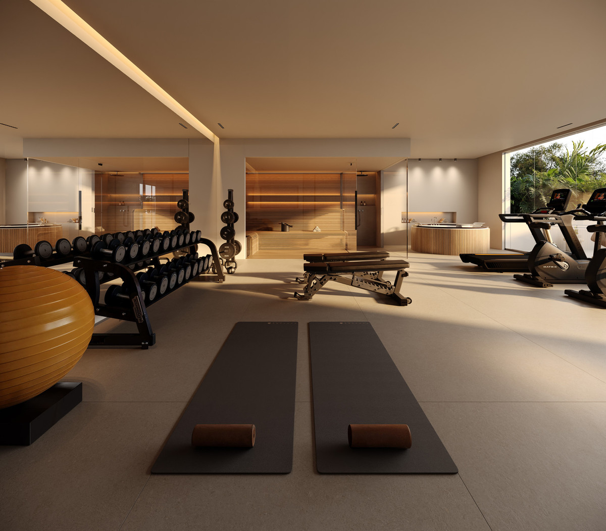En trappa ned från denna nivå når man övervåningen, som inkluderar den vertikala kommunikationskärnan, en fördelningshall, en gästtoalett, ett tekniskt rum, ett elrum samt ett gym med bastu som öppnar upp mot en pergolatäckt terrass, vilket skapar en privat wellnessavdelning med rikligt dagsljus och komfort.