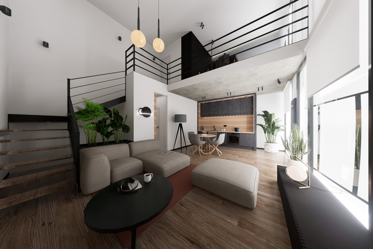 • Bostäder med dubbel takhöjd, alla med privat terrass och egen ingång.