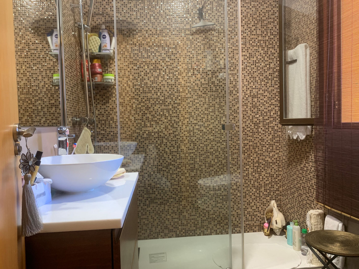 Två fräscha badrum utrustade med toalett, handfat och dusch.
