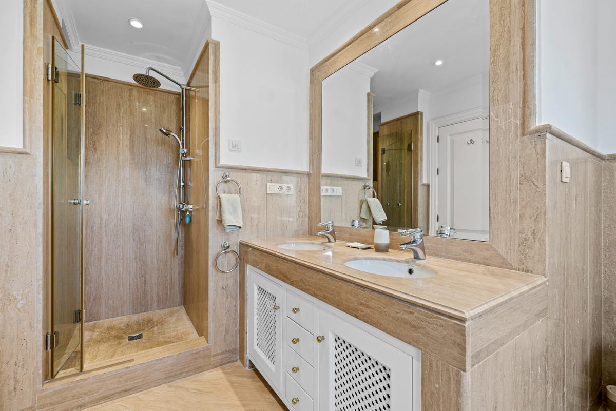Fastigheten har tre dubbelrum med egna badrum, inklusive mastersviten med ett stort privat badrum med hörnbadkar med jacuzzi, duschkabin och dubbla handfat. Varje sovrum har direkt tillgång till den stora terrassen. Det finns också en separat gästtoalett. Luftkonditionering finns i hela fastigheten och golvvärme i badrummen.