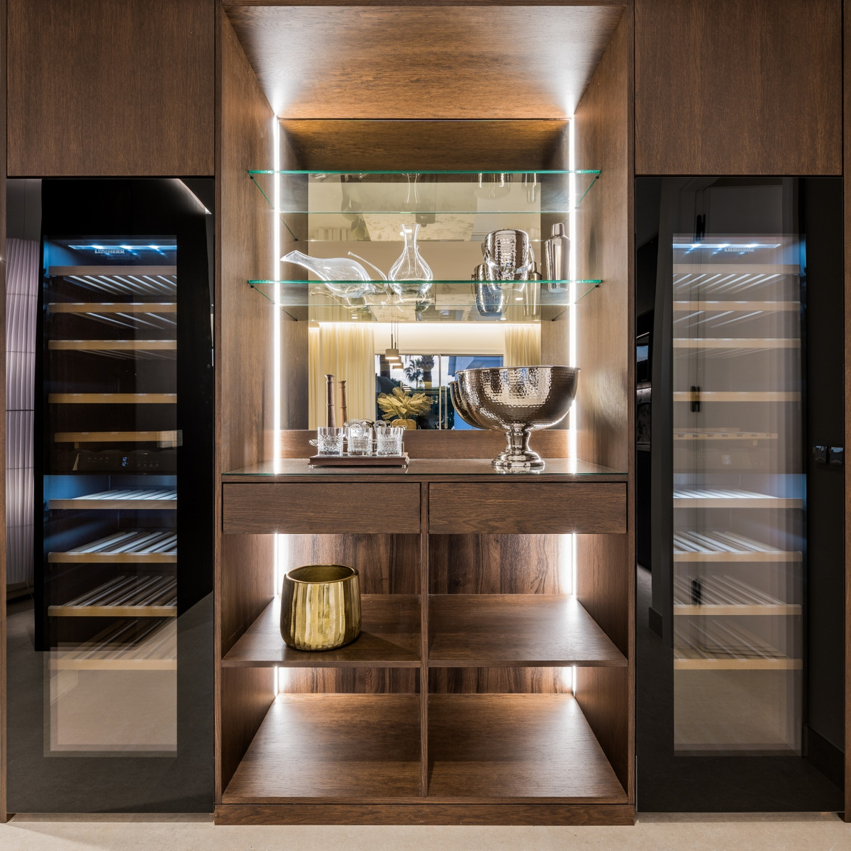 Every detail of the apartment has been carefully designed, from the state-of-the-art Bang & Olufsen sound system and the electric fireplace in the living room, to the custom-made wardrobes and the elegant freestanding bathtub.
