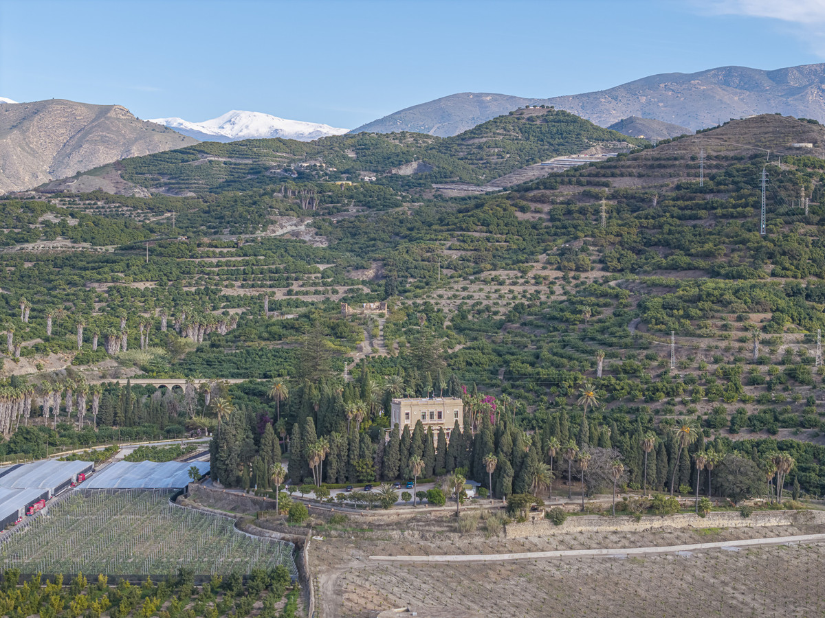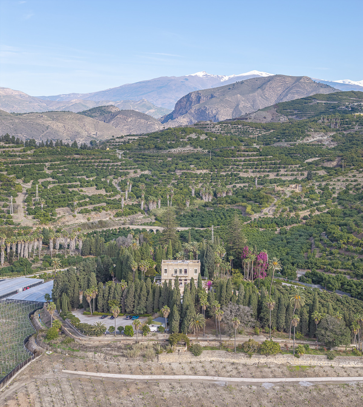 Set on a hilltop in Motril, Granada, Casa de los Bates captures panoramic views across three distinct landscapes: the Mediterranean coastline, the productive farmland of the Motril plain, and the historic town of Salobreña. This 827 sqm Italian-style manor house dates from the 19th century and holds protected status as part of Motril's cultural heritage.