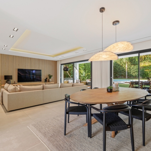 This home is a modern six bedroom luxury villa for sale in the Golf Valley of Marbella. The home offers 600 m² of space on an 820 m² plot with 125 m² of terraces. The villa sits minutes from Aloha Golf Los Naranjos and Las Brisas Golf Club and it offers fast access to shops restaurants and Puerto Banús which makes it ideal for buyers who want privacy and convenience.