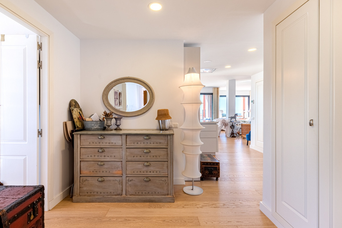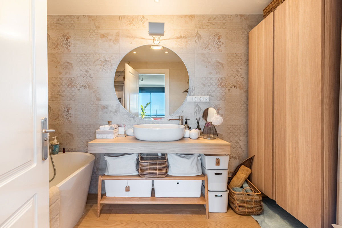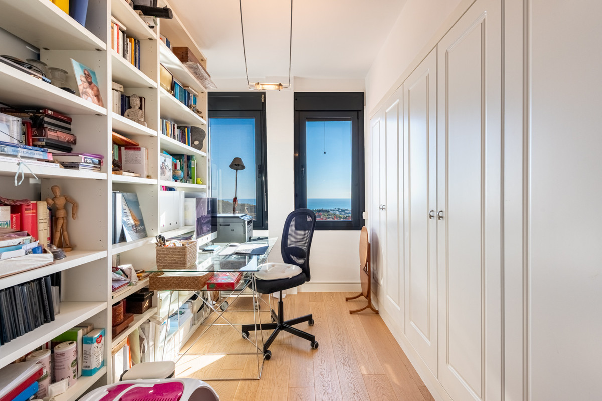 Sovrumsdelen som innehåller huvudsovrummet och ett andra sovrum har också fantastisk havsutsikt från båda sovrummen med direkt utgång till terrassen. Ett sovrum har eget badrum med både badkar och dusch. Det andra badrummet i hallen har dusch.