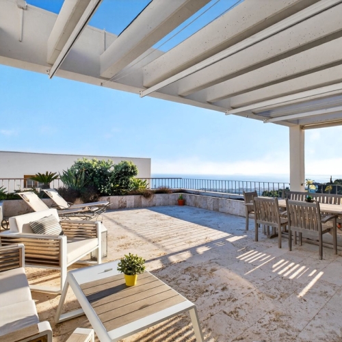 The apartment offers approximately 94 m² built, plus an 11 m² private terrace, and comprises two bedrooms, two bathrooms, an open-plan living and dining area, and a modern fully equipped kitchen. Large windows and direct access to the terrace create a seamless indoor-outdoor living experience with the Mediterranean as a constant backdrop.