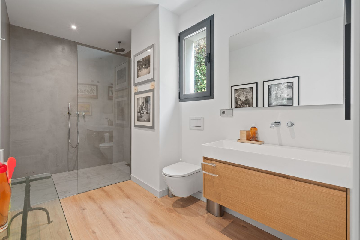 The outdoor areas reflect the Mediterranean lifestyle at its purest. A long swimming pool forms the heart of the garden, surrounded by lush greenery and mature trees. Terraces shaded by sleek wooden pergolas invite dining outdoors, while a secluded gazebo offers an intimate space to take in the scenery.