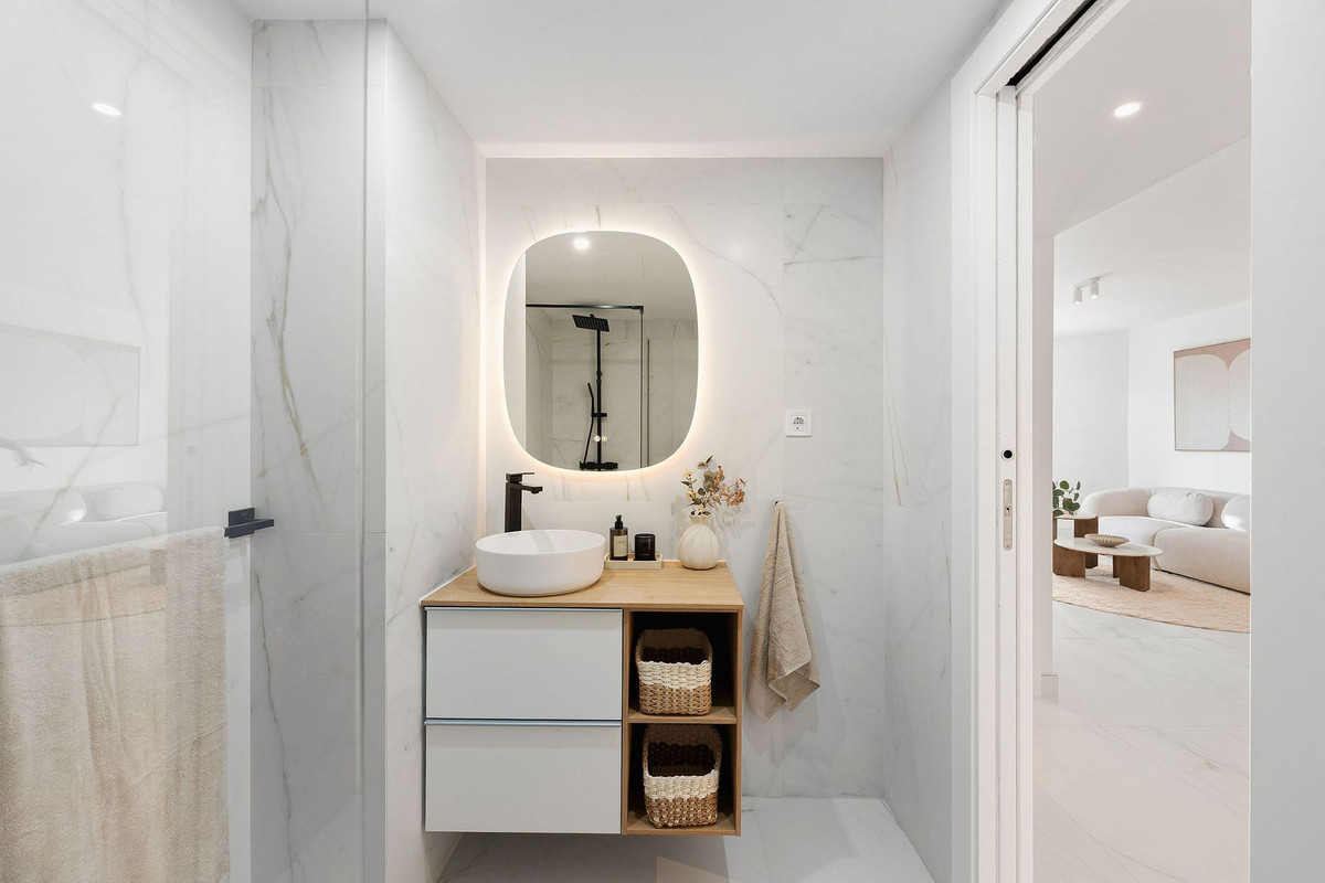 Lägenheten har fullt renoverats med en modern design, inredningen har en öppen planlayout som maximerar naturligt ljus och harmoni. Det ljusa vardagsrummet strömmar in i ett elegant, fullt utrustat kök med integrerade apparater och moderna ytor. Det rymliga sovrummet erbjuder inbyggda garderober och en lugn atmosfär, medan det eleganta badrummet visar högkvalitativa inredningar och en ren, modern stil.
