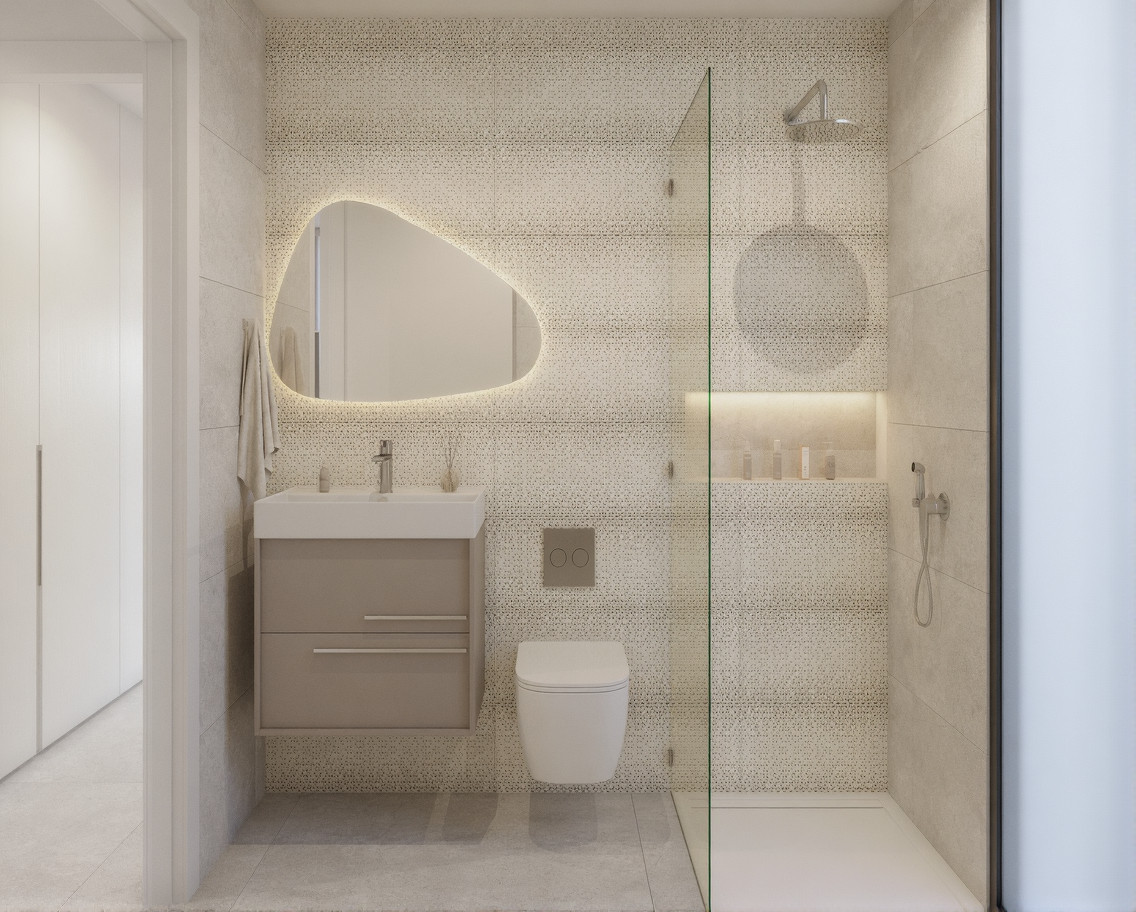 Rymliga terrasser, solarier och anlagda medelhavsträdgårdar möjliggör sömlöst inomhus-utomhus liv, kompletterat med privata och gemensamma pooler samt fritidsområden.
