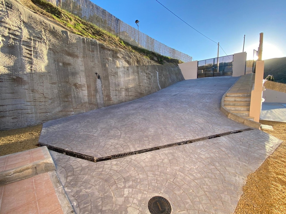 The pool area features a brand-new swimming pool with a 10-year structural warranty, surrounded by an elegant terrace offering ample space for sun loungers, along with an outdoor shower.