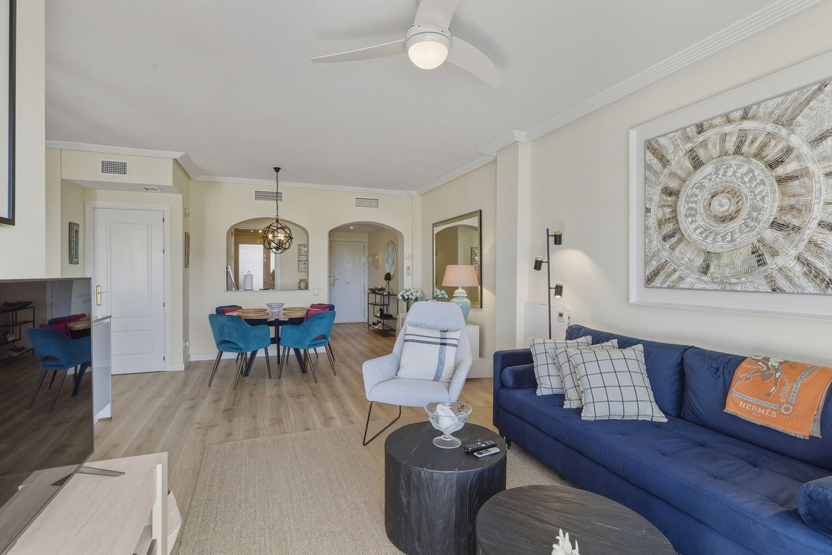 Denna eleganta lägenhet på första våningen i Los Arqueros, Costa del Sol, erbjuder den perfekta kombinationen av modern komfort och boende i resortstil. Belägen i ett eftertraktat frontline-golfområde med ett fördelaktigt sydvästläge får bostaden sol hela dagen samt havsutsikt, utsikt över de omgivande bergen, perfekt skötta fairways, vackert anlagda trädgårdar och de gemensamma poolerna. Den ligger i ett säkert, inhägnat community med bevakning dygnet runt, endast en kort bilresa från lokala butiker, byn Benahavís och de livliga bekvämligheterna i Marbella och Puerto Banús.