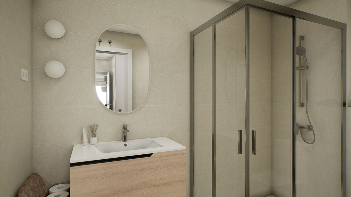 The apartment has a total built area of 64 m², well distributed into a bright living–dining area, an open-plan kitchen, two bedrooms one with fitted wardrobes, and two modern bathroom. Additional features include partial air conditioning, wood flooring, and a private terrace, providing a pleasant outdoor space.