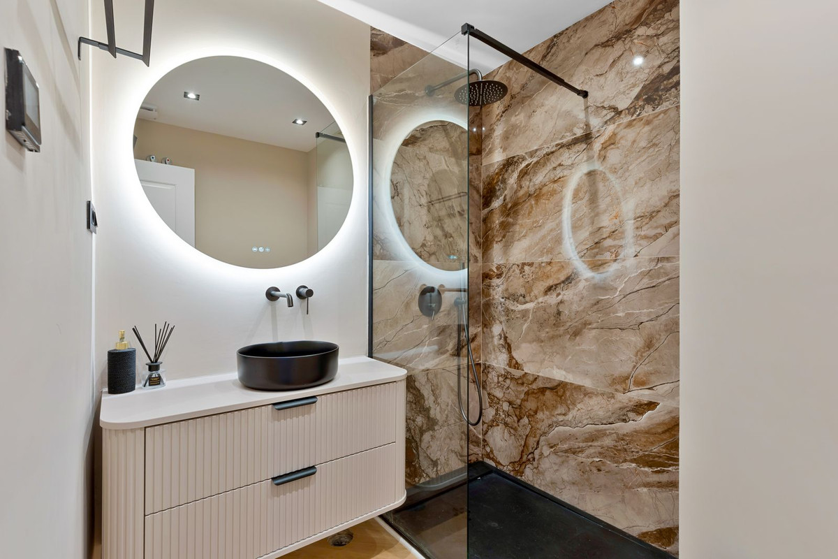 The top floor offers a generous 20 m² bedroom with ensuite bathroom designed for full privacy and comfort. Large windows offer breathtaking panoramic views, filling the space with natural light and creating a seamless connection to the outdoors. The suite is complemented by two terraces. One terrace overlooks the communal swimming pool with stunning sea views, while the second terrace offers stunning mountain views of La Concha ideal for enjoying both sunrise and sunset in complete privacy.