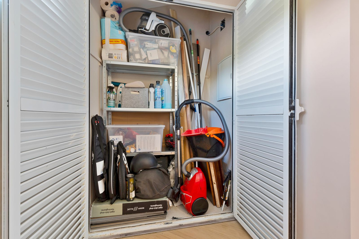 A dedicated space with a steel-framed glass door has been prepared for a temperature-controlled wine cabinet positioned under the stairs, providing a unique and elegant feature for wine enthusiasts. Practical storage and a washing machine are discreetly located behind the kitchen area, keeping the space uncluttered. A separate guest toilet with a sink is conveniently located for visitors. The living area connects beautifully to the outdoor spaces, featuring a private terrace at the entrance and an additional private terrace at the rear, directly accessible from the dining area, offering a perfect connection to the outdoor area and the communal swimming pool.