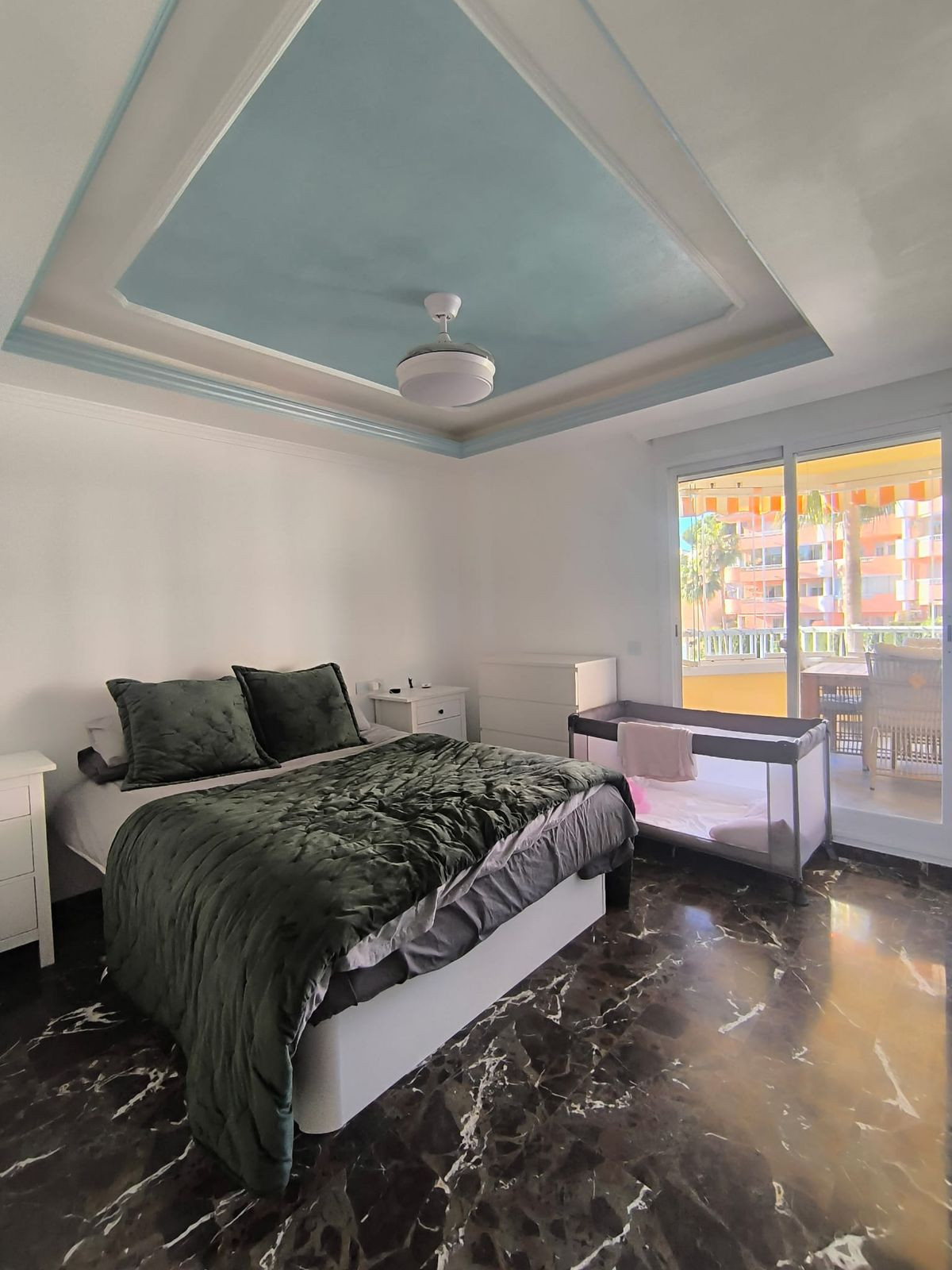 The bright living-dining room provides access to a fantastic glazed terrace with a Lumon system, perfect for enjoying the views of the urbanization and the sea year-round.