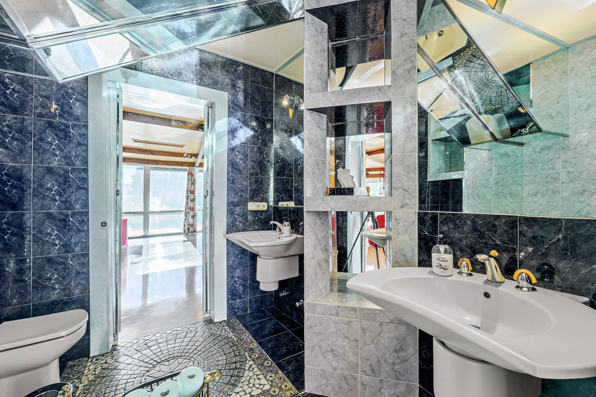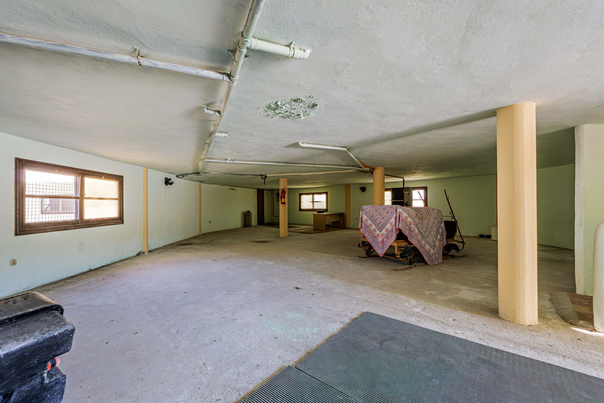 The estate comprises two distinctive octagonal buildings. The main residence, with 2,058 m² of built area, is arranged over several floors connected by staircases and elevators, offering generous spaces designed for both residential and professional use. The ground floor features a social lounge, reception area, guest WC, staircases, lift and a pleasant covered porch. The upper floor includes guest rooms, bathrooms, offices, private offices, a library, meeting room, exhibition areas, and the corresponding corridors and lifts. The dwelling also has two basement levels used for storage rooms, lobbies, bathrooms, service areas and facilities, plus an additional garage basement with mezzanine, providing excellent storage capacity and functionality.