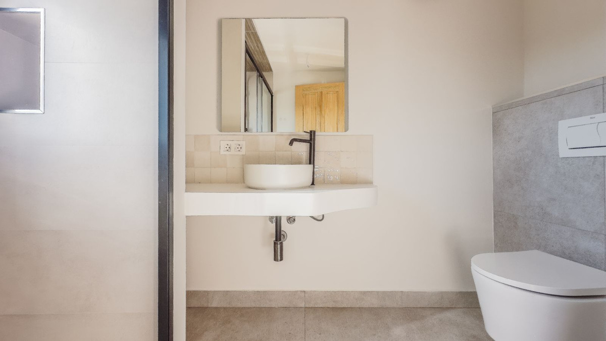 Also on this level is a perfectly finished, tasteful bathroom featuring a large walk-in shower, vanity unit, sink, mirror and toilet.