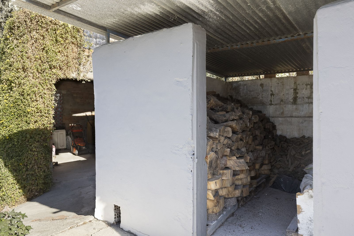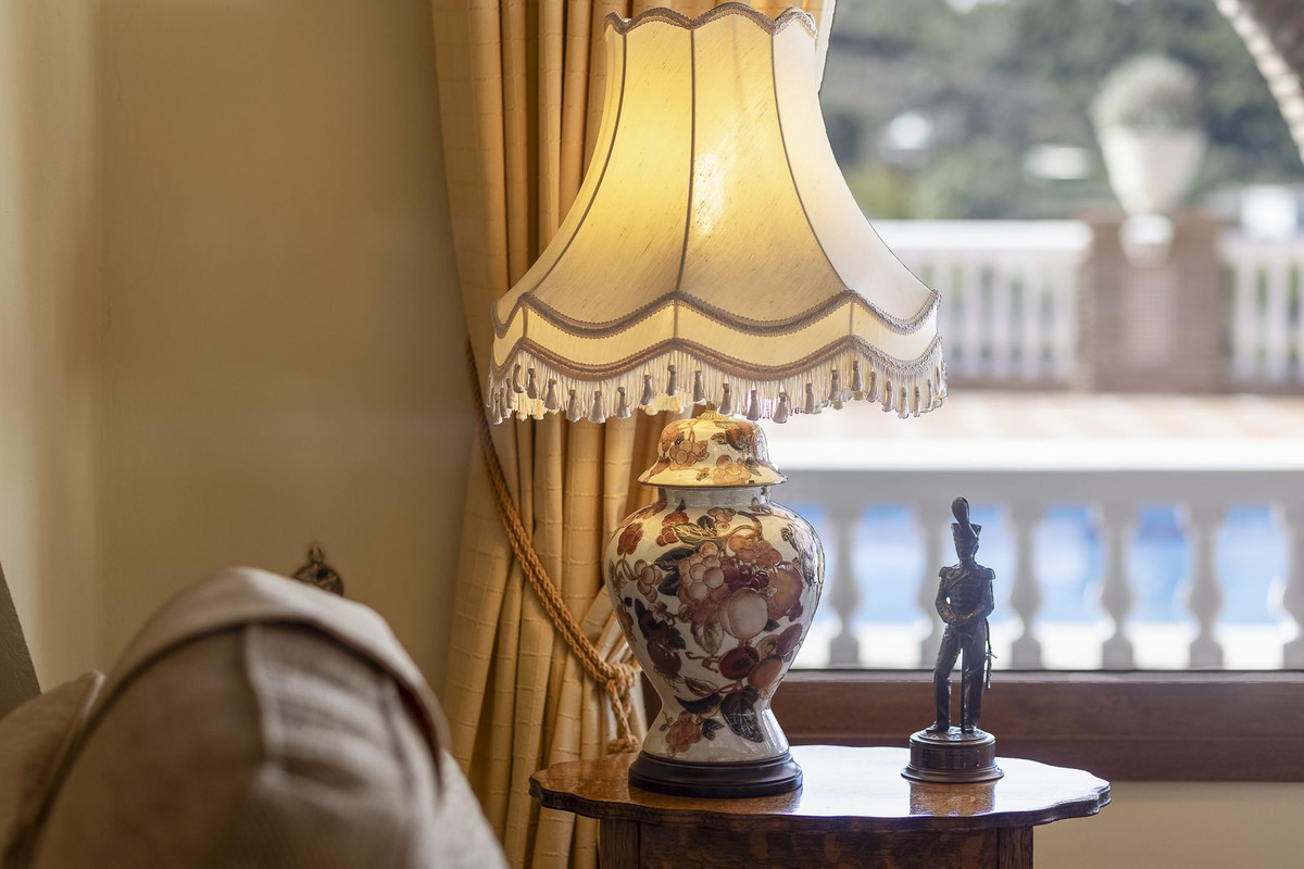 Huvudhuset har ett ljust och rymligt vardagsrum med flera valvformade fönster som vetter mot terrasserna, trädgården och poolområdet.