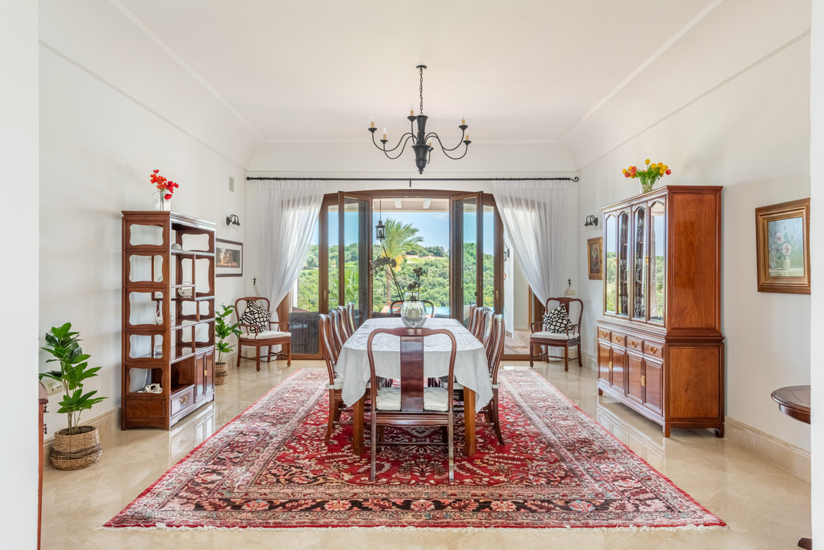 It comprises, on the entrance level: fully fitted kitchen with double-height ceilings, breakfast dining table, and offers stunning views to the sea. There are a formal dining and sitting room, a living room with fireplace and large windows that maximise the views to the San Roque Golf course and beyond. On this level there are 2 en-suite bedrooms, a study/further bedroom, a utility room and double garage. With independent access is a games room/gymnasium that can be converted into guest suite or staff quarters.