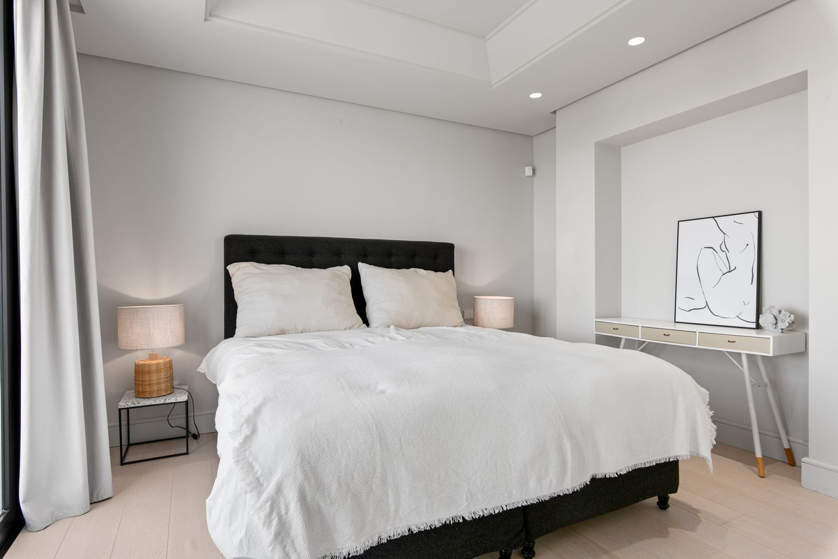 The main level is dedicated to contemporary open-plan living, framed by floor-to-ceiling windows that flood the space with natural light and seamlessly connect indoors with the surrounding landscape. Expansive sliding doors lead to a large terrace, ideal for outdoor dining for up to twelve guests while overlooking the Mediterranean. This level also includes a stylish gas fireplace, guest toilet, and a fully fitted kitchen with Silestone worktops and high-end Miele appliances, complemented by an outdoor laundry area and a charming garden.
