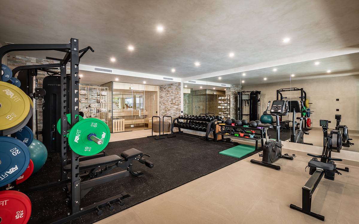 Ytterligare funktioner förbättrar hemmets överklagande, inklusive ett dedikerat wellnessområde med en bastu och ångrum, ett spelrum och en privat hiss som lägger till både bekvämlighet och tillgänglighet. Taket solarium erbjuder en fantastisk miljö för avkoppling, komplett med ett BBQ-område, dusch och en utomhus lounge med panoramautsikt - idealisk för solnedslagna eftermiddagar eller kvällssamlingar.