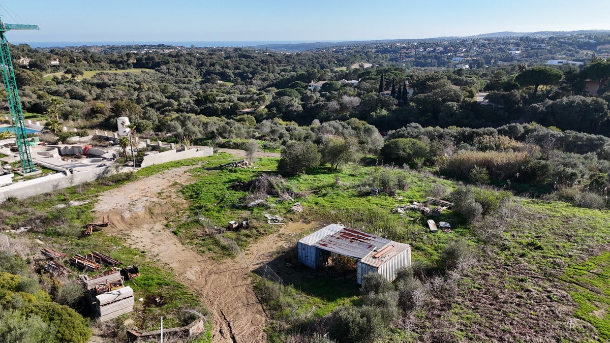 To the east, a 3,700 m² plot with a large contemporary white villa currently nearing completion.
