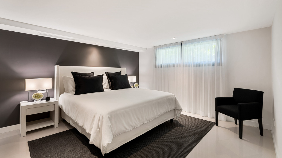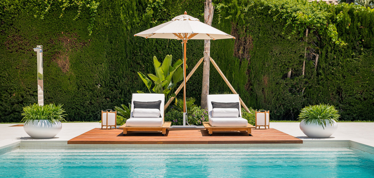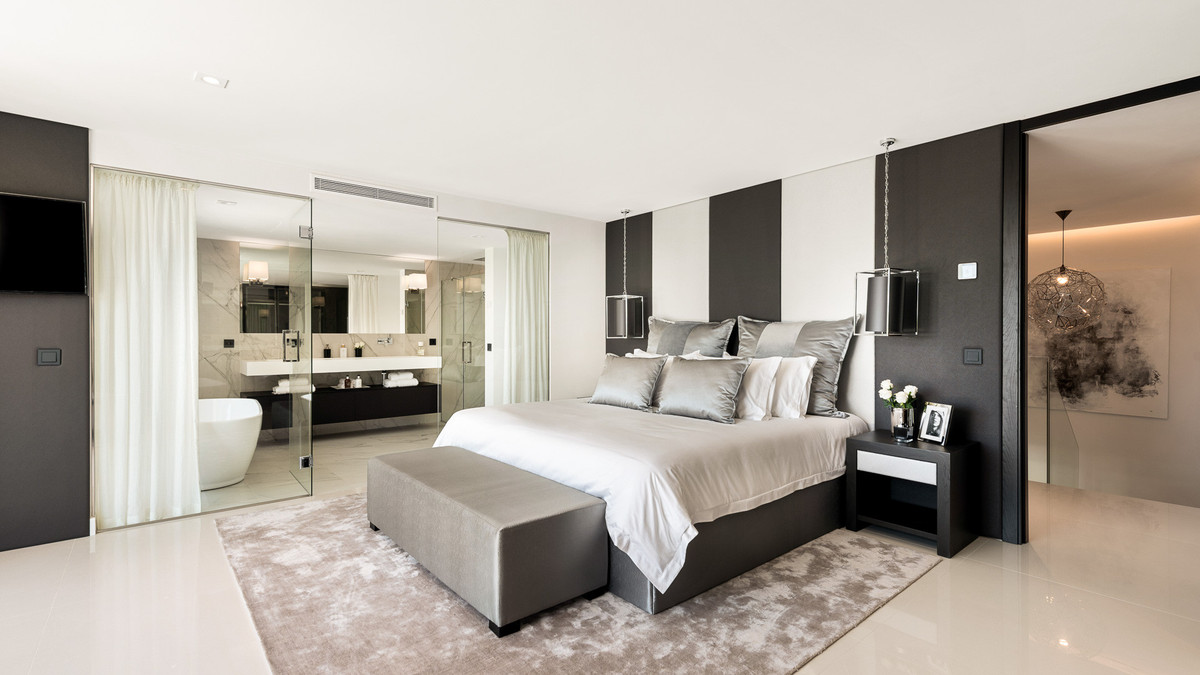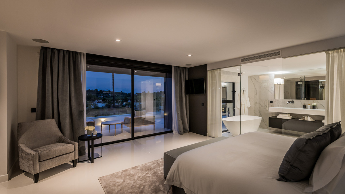Spectacular villa designed by a well-known award-winning architect located in a privileged setting in the heart of the Golf Valley of Nueva Andalucía, one of the most sought-after residential areas on the Costa del Sol. This southwest-facing villa is distributed over three floors and comprises, on the entrance level: bright hall leading to a huge open-plan living area divided into three seating areas, Italian designer kitchen fully equipped with Gaggenau appliances and dining area. All leads to a spacious porch, the beautiful landscaped gardens with a stunning chill out zone with water features, the extra sized heated pool with outside shower and plenty of space to sunbath and the outside BBQ kitchen - all with stunning views over the the golf course. Upstairs: master bedroom with a huge elegant wardrobe, en-suite bathroom and access to the terrace to enjoy the views, even from the bathtub; further suite; 2 bedrooms sharing a bathroom. All bedrooms have spacious built-in oak wardrobes. Lower level: 2 more bedrooms; laundry room; wine cellar; gym and a home-cinema. Built to the highest specifications and finishes, including bathrooms with Dornbracht fittings to mention a few. Quietly located, undisturbed, on an elevated plot on the golf course. Situated only a few minutes' drive to the renowned Aloha international college and Aloha, with its rich selection of restaurants, bars and amenities. Only 5 minutes' drive to Aloha Golf, Las Brisas Golf, La Quinta Golf, Magna Marbella Golf, and a wide selection of tennis and paddle tennis courts. Only 10 minutes' drive to Puerto Banús, the beach and Marbella's Golden Mile.