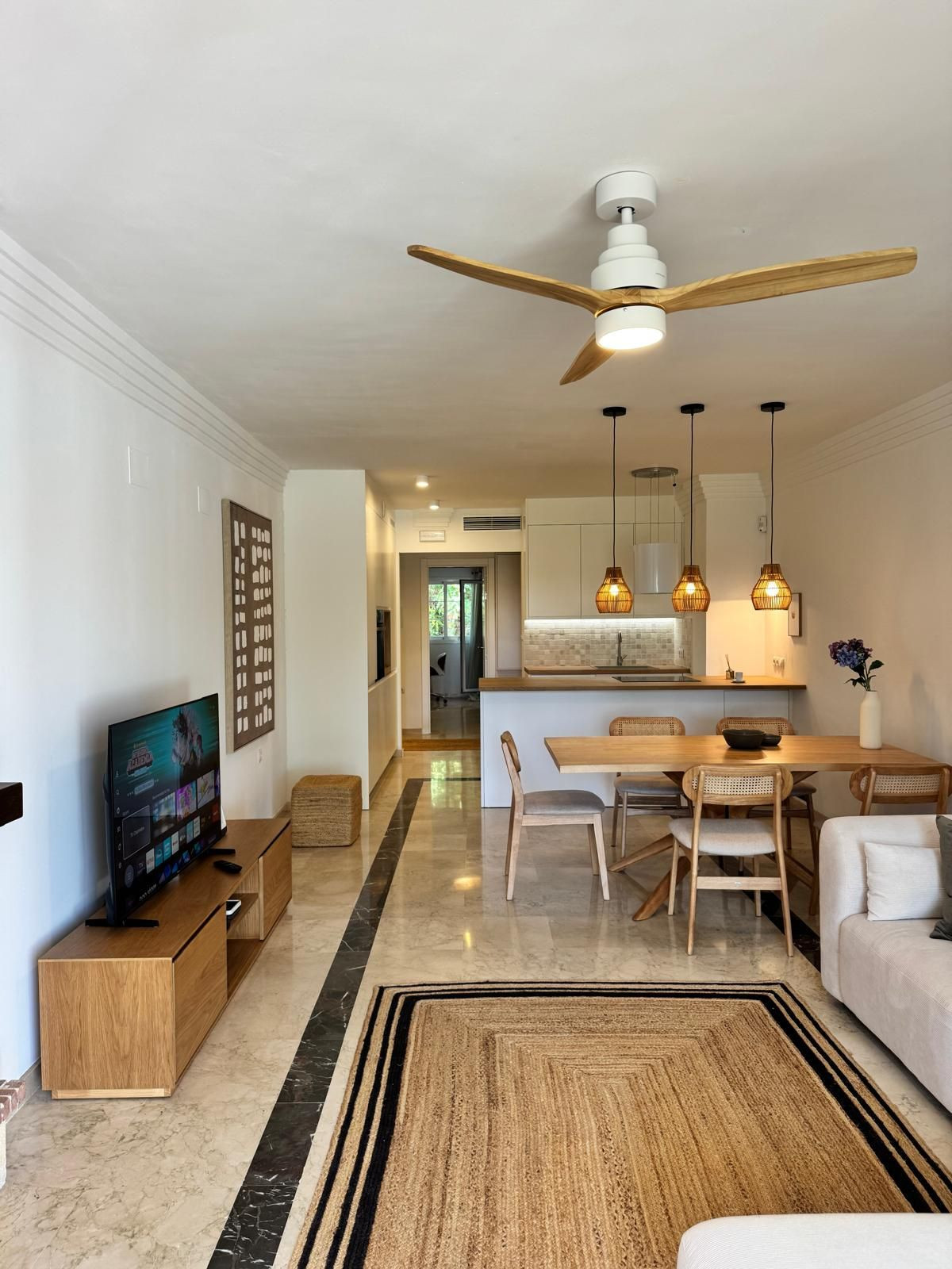 Discover this exclusive ground floor apartment, fully renovated and furnished, located in the prestigious Lomas de Río Real development, one of the most sought-after residential areas in Marbella East. Surrounded by greenery and tranquillity, just minutes from the beach and the renowned Trocadero Arena, and adjacent to Río Real Golf Club.