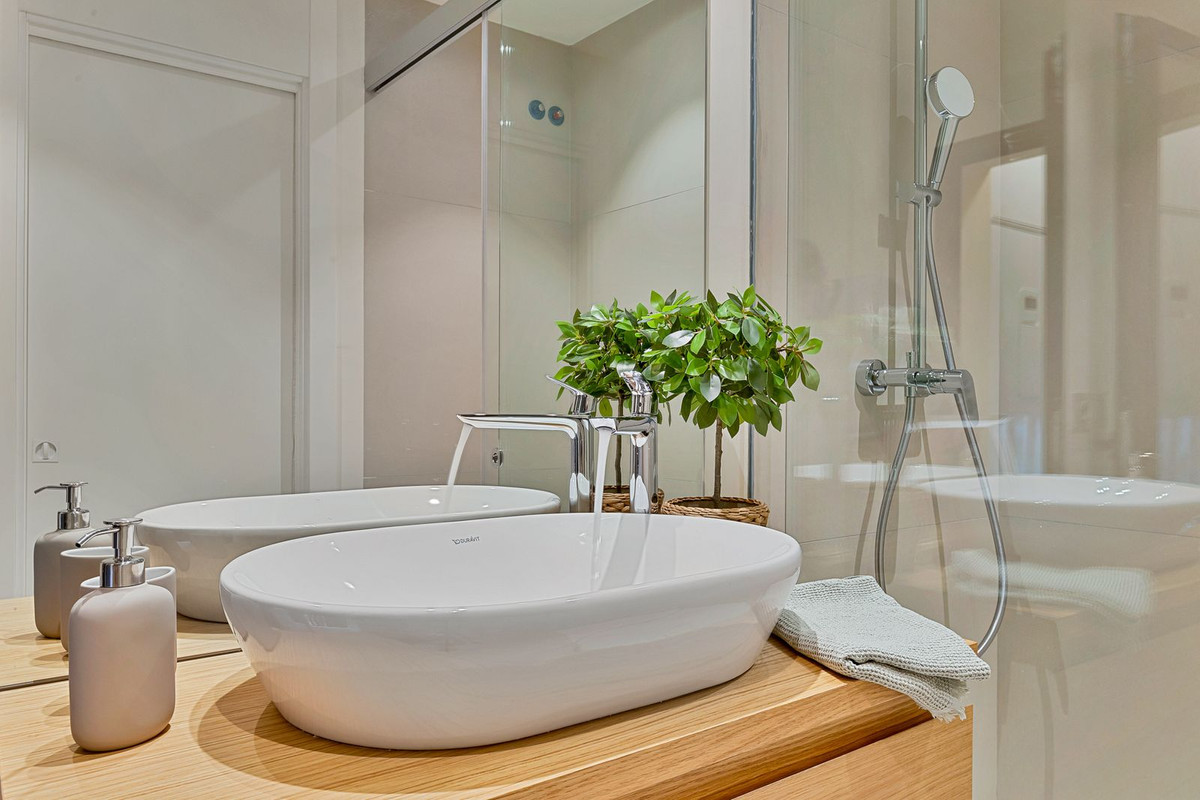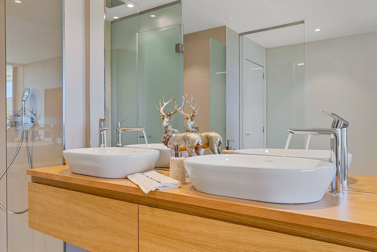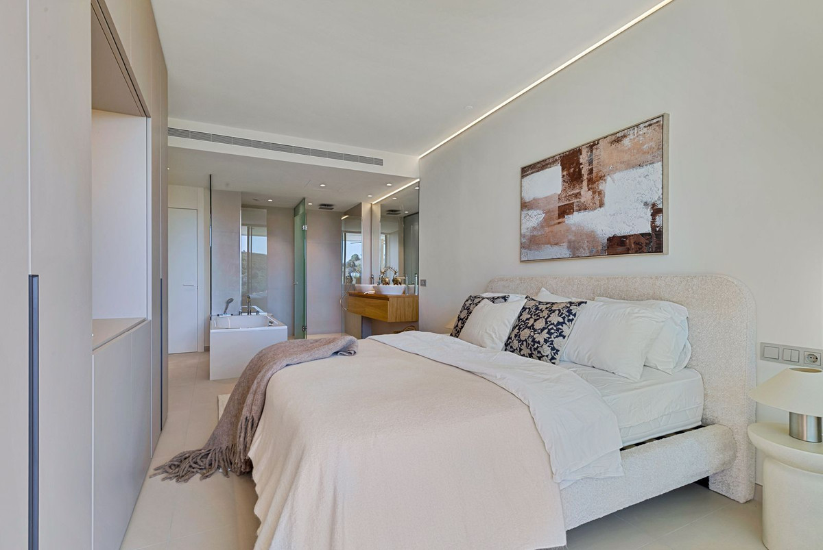 Master bedroom är designat med stil och komfort i fokus, med ett fristående badkar och direkt utgång till den stora terrassen. Det är en plats för långsamma morgnar och stillsamma kvällar, där varje detalj bidrar till den genomgående lyxiga känslan.
