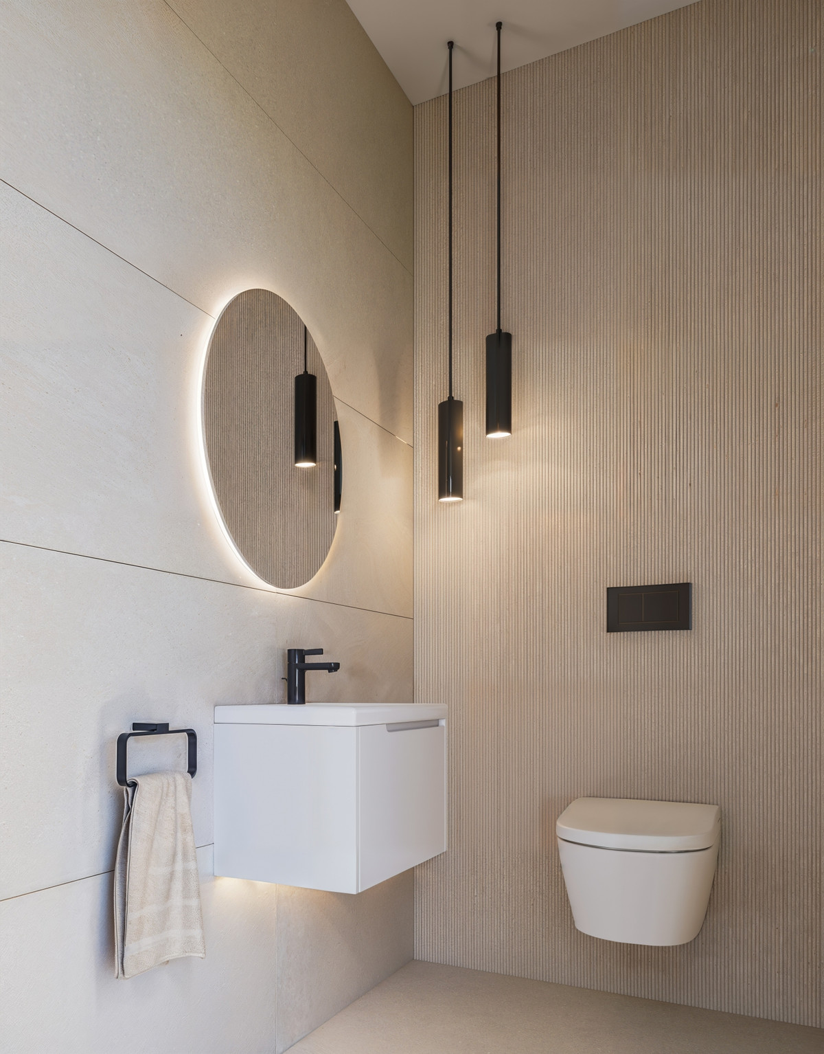 Badrum en suite i det sekundära sovrummet, utformat med toppmoderna armaturer och en raffinerad, samtida estetik. Helkaklad porslinsklinker från golv till vägg och en minimalistisk duschzon med glasvägg från golv till tak. Integrerat tvättställ på bänkskiva med en högkvalitativ kommod med två lådor (finns i färg- eller träeffektutförande) och en bakbelyst spegel som förstärker både funktion och stil.