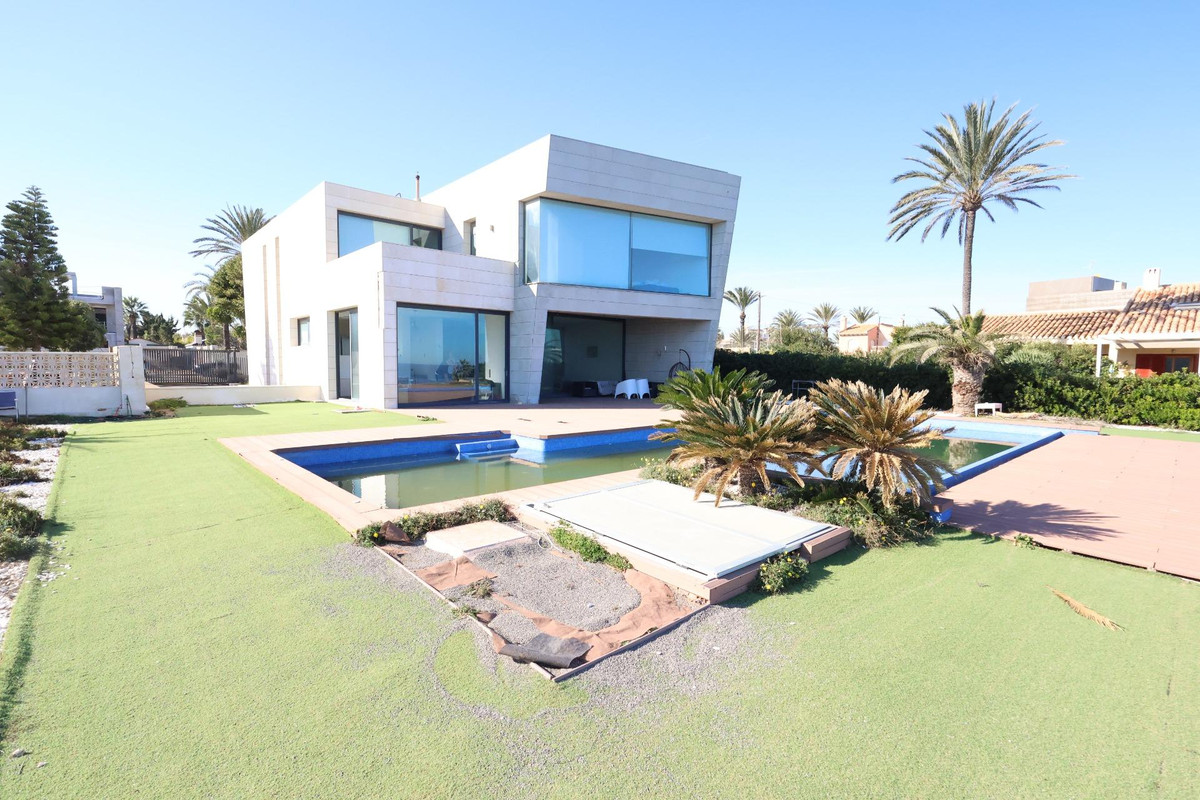Cabo Roig: Frontline villa near Cala Capitán beach. 1,339 m2 plot with a 655 m2 house (two floors plus basement). Features 6 bedrooms (2 downstairs, 4 upstairs), 5 bathrooms, large living-dining area, spacious kitchen, large garage, and swimming pool.. . The house requires renovation.