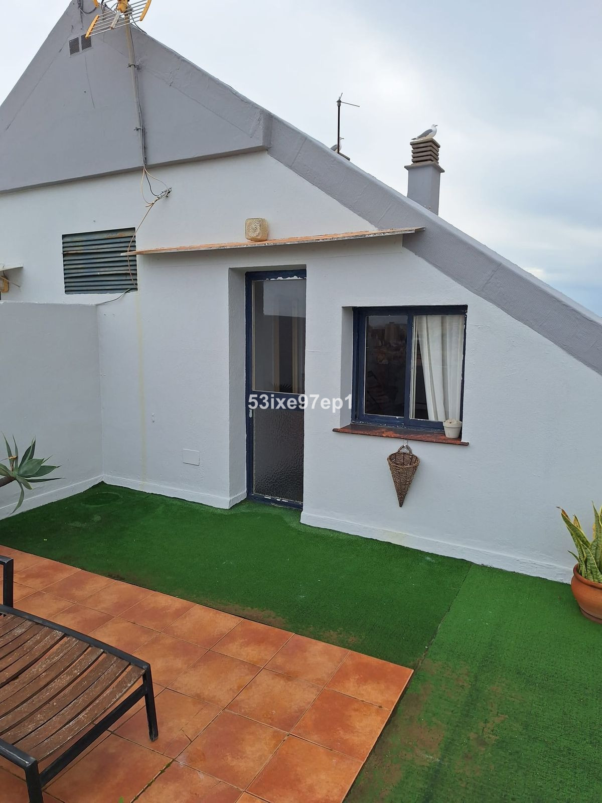 Från hallen kommer vi därefter in i vardagsrummet med utgång till en terrass där man ser ut över takåsarna i Fuengirola ner mot havet.