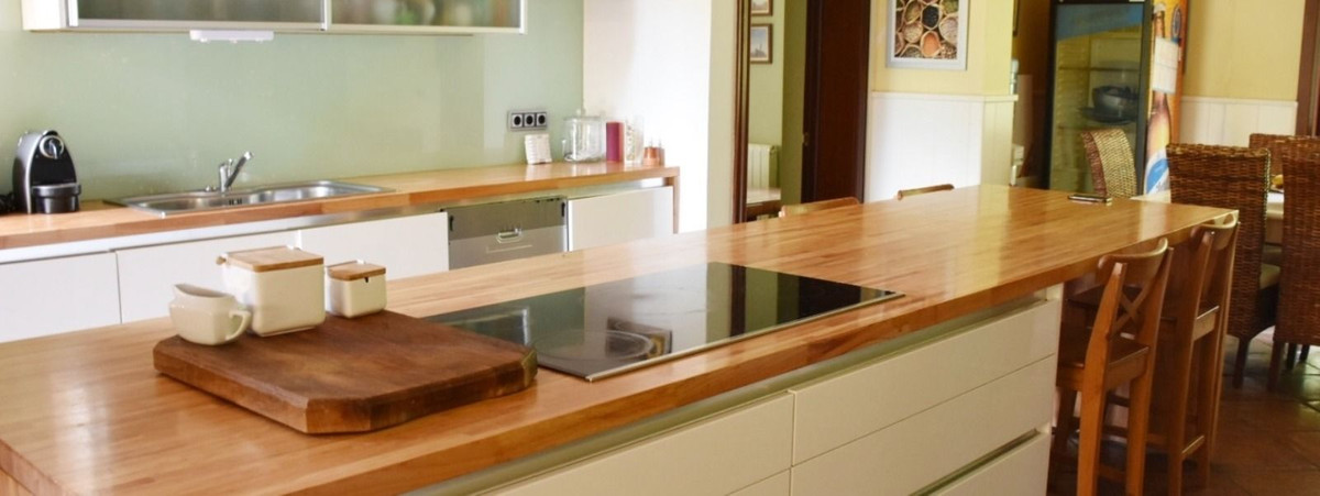 The fully fitted kitchen is equipped with modern appliances, including fridge, microwave and dishwasher, and features a long wooden worktop that also serves as a breakfast table. Adjacent to the kitchen is a second living room or TV lounge, providing an additional comfortable relaxation area. This level also includes the master bedroom, with very large walk-in wardrobes and an impressive spa-style bathroom with a round bathtub, as well as another bedroom with en-suite bathroom and a convenient laundry room.