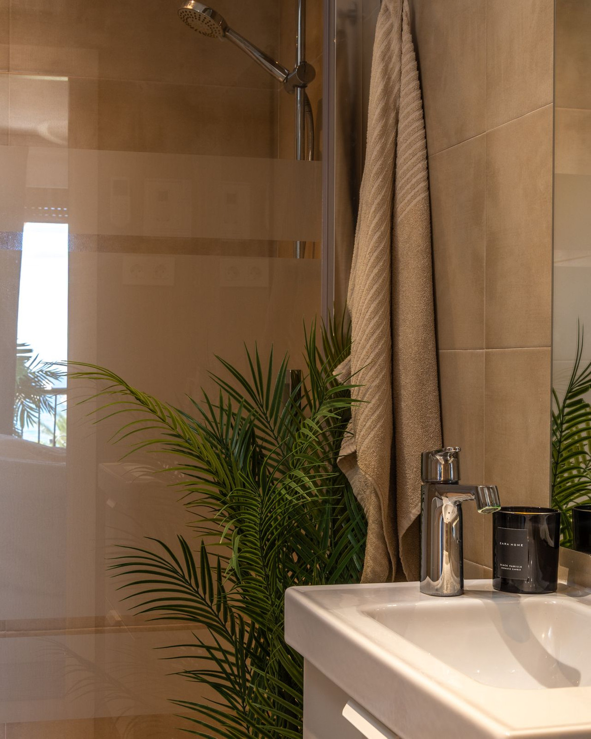- Badrum 1: Anslutet till master bedroom. Snyggt renoverat med dusch, handfat, toalett och förvaringsmöbel.