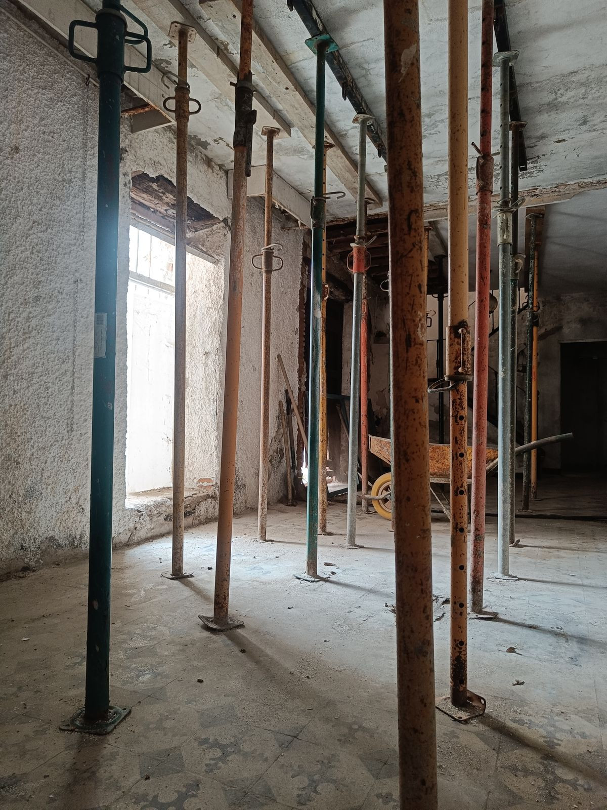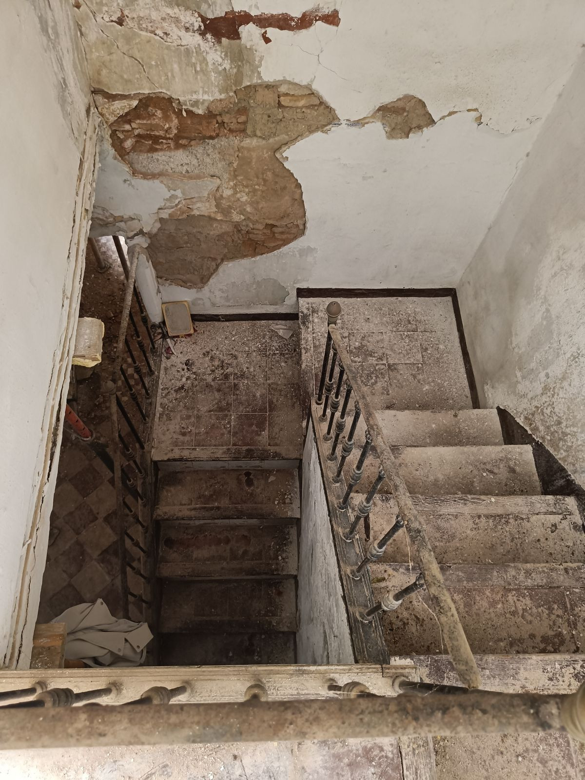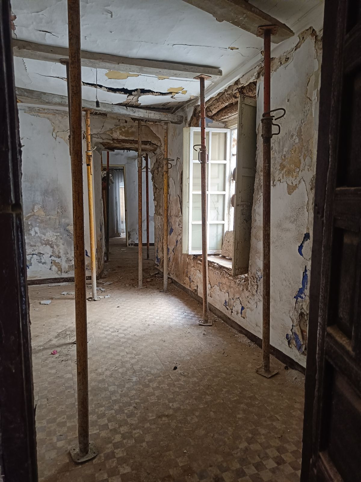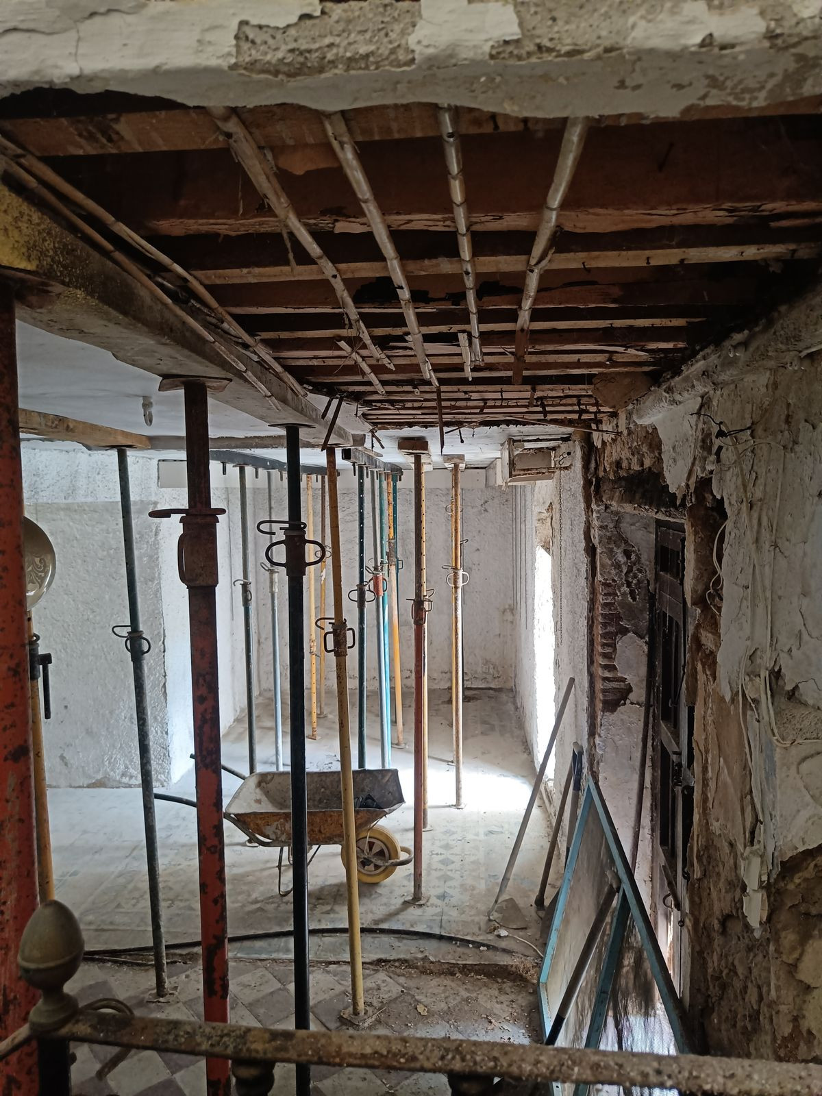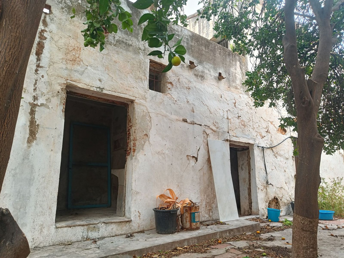 The ground floor features a spacious entrance hall, a bedroom, and the former kitchen area. From here, you can access a patio with an outdoor bathroom and a secondary entrance leading to a small private garden, perfect for enjoying the Mediterranean climate.