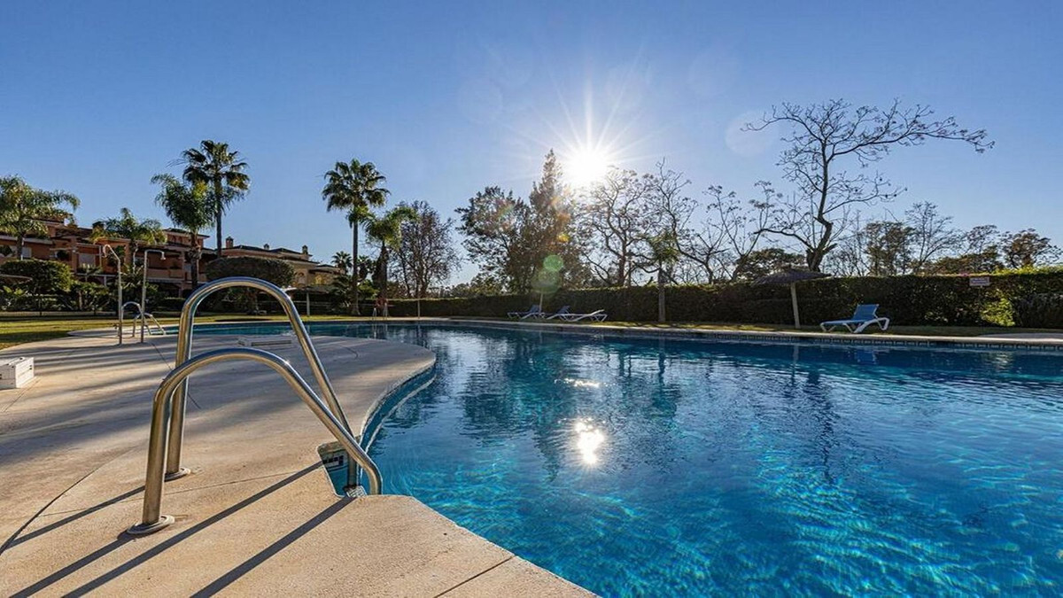 Superb spacious townhouse located in one of the most sought after urbanisations in Guadalmina Baja. Set in sumptuous landscaped gardens with a generous sized swimming pool. The property is on two storeys with a large storage in the basement and double garage. Impeccably maintained, the house has a large terrace at the entrance. Consisting of an entrance hall, kitchen, toilet, split level lounge with a fireplace leading onto a south west facing terrace with views of the gardens, pool and golf course. Upstairs level has 3 good sized bedrooms with ensuite bathrooms and a terrace in the master. Ideally positioned within walking distance of the beach, golf course, commercial center and International Schools. Easy access onto the motorway with Puerto Banus only 10 minutes away.
