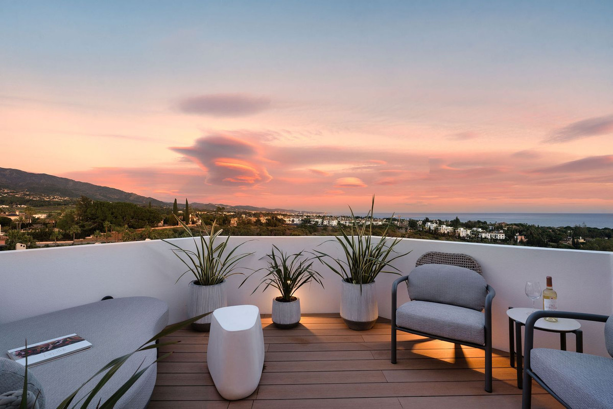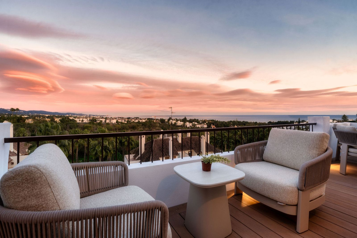 Set within the prestigious Golden Mile, this exquisite fully renovated duplex penthouse in the sought-after Coto Real is a rare blend of elegance, comfort, and breathtaking scenery. South-facing and bathed in natural light throughout the day, the property enjoys panoramic sea and mountain views that unfold from sunrise. The interiors have been carefully redesigned using high-standard materials and finished in warm, subtle tones, creating a refined yet inviting atmosphere that feels both luxurious and timeless. The penthouse offers three beautifully appointed bedrooms, the master has a walk-in closet and a private west facing terrace, two stylish bathrooms, and an additional guest toilet, perfectly laid out over two levels to ensure privacy and functionality. Every space flows effortlessly, enhancing the sense of openness while framing the stunning Mediterranean and surrounding mountain landscape. A truly exceptional home for those seeking a turn-key luxury residence in one of Marbella's prime locations—where sophisticated design meets unforgettable views.