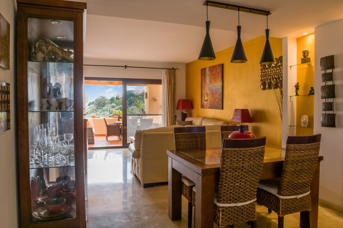 Invändigt har lägenheten uppdaterats med ett utökat öppet kök, vilket skapar en ljus och social yta mellan kök, vardagsrum och matplats. Stora fönster släpper in rikligt med dagsljus och ramar in utsikten över Medelhavet.