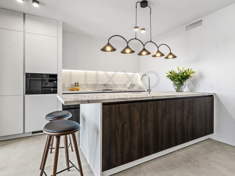 The property offers two comfortable bedrooms, each with its own beautifully finished bathroom. The entire apartment features a brand-new stylish floor and plenty of smart storage solutions, including custom-made wardrobes. There is also a separate storage and laundry area with extra cupboards and a neatly integrated built-in washing machine.