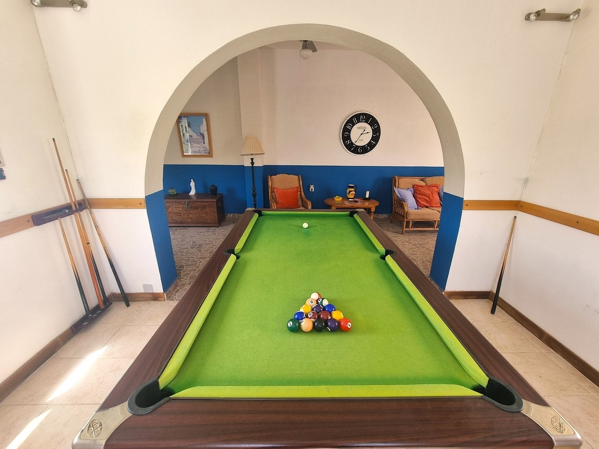 Accessed via an electric sliding gate or a separate pedestrian gate, the property immediately impresses with its beautifully landscaped garden to the right and a generous driveway to the left, leading to a large garage with rear access to the garden and pool area. The front of the villa welcomes you with a fully enclosed lower terrace that wraps around the house. This space has been transformed by the current owners into a relaxing games and lounge area, complete with a pool table and comfortable seating.