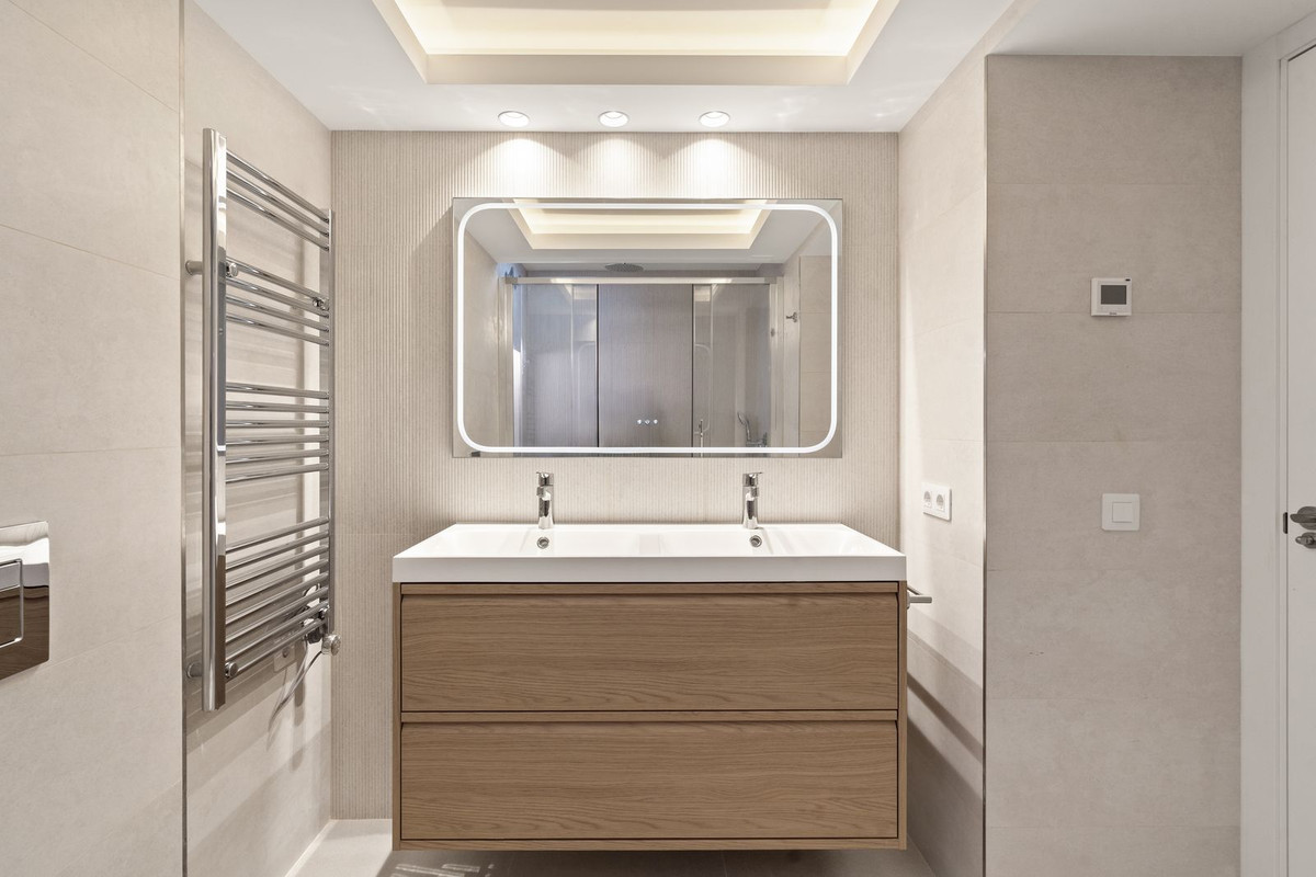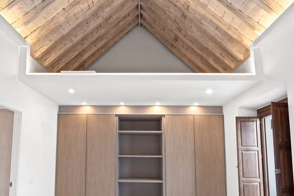The entrance leads into a calm and well-defined interior where neutral tones and clean lines create a sense of continuity. Flooring, lighting, and carpentry have been carefully selected to enhance proportion and flow, resulting in spaces that feel both practical and understated. Natural wood details introduce warmth and contrast, reinforcing the connection between different levels of the home.