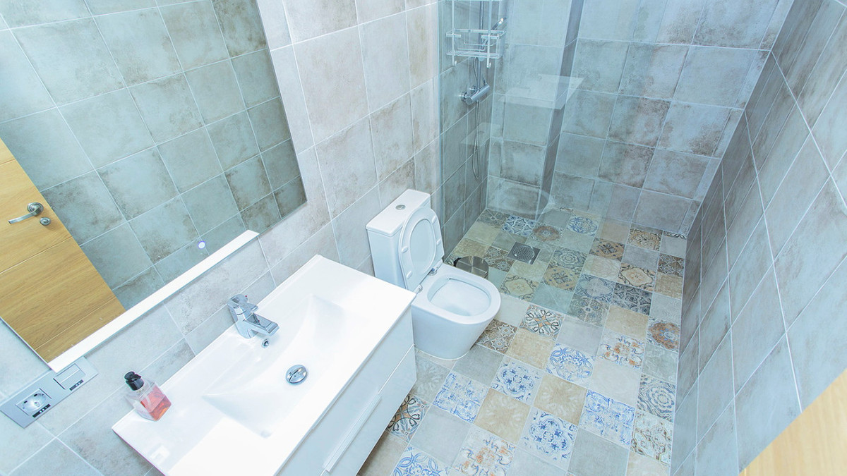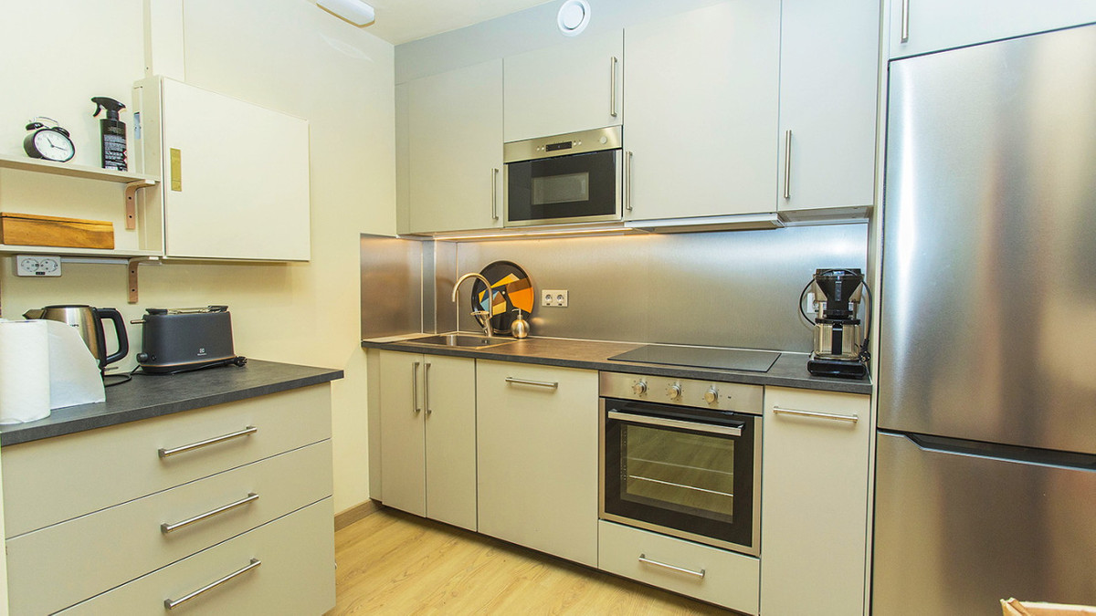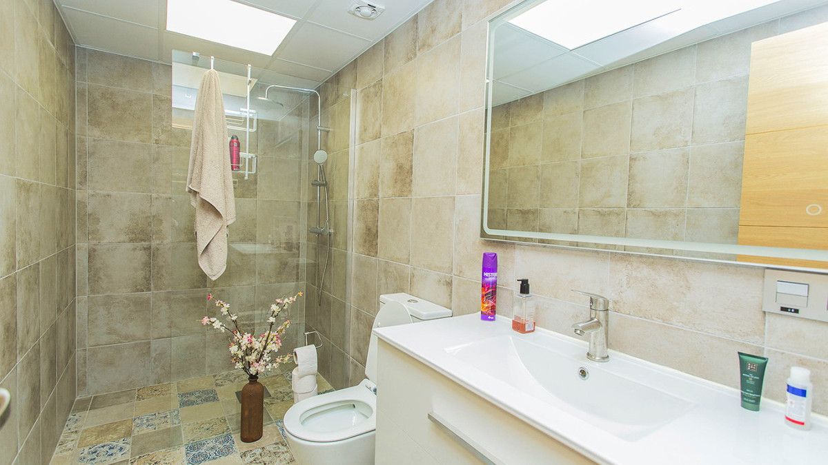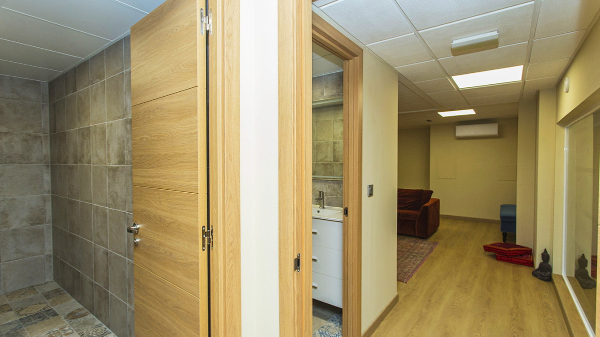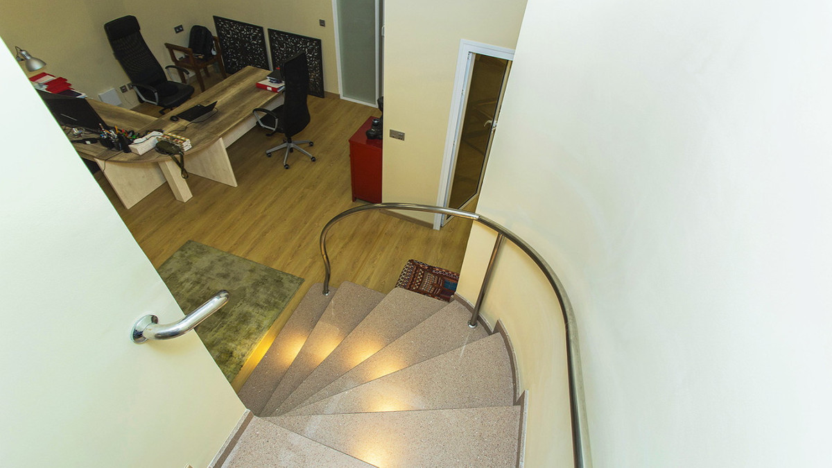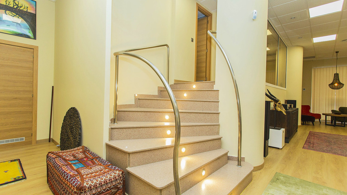 Det finns två kompletta badrum. Lokalen har en användbar yta på 105 meter. Vissa möbler ingår, såsom: Skrivbord etc. Central luftkonditionering, larmsystem etc. Trägolv och fullt utrustat kök med vitvaror. Konferensrum.