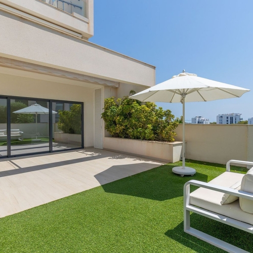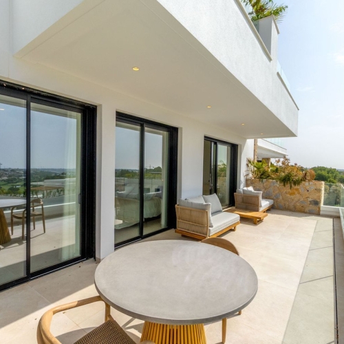 Denna smakfullt inredda tre‑sovrumslägenhet med två badrum finns i exklusiva Madroño‑området vid Las Colinas Golf & Country Club. Lägenheten är aldrig tidigare bebodd och är vackert belägen med utsikt över golfbanan, omkringliggande natur och, vid klar himmel, Medelhavet i fjärran. Master bedroom har ett privat badrum en suite, medan de övriga två sovrummen delar ett andra modernt badrum. Det öppna köket med köksö har en integrerad matplats och övergår naturligt i vardagsrumsdelen. Inredningen präglas av jordnära färger, designbelysning och väggar med träpaneler där integrerad belysning vid socklarna skapar en exklusiv känsla. Två rymliga terrasser förlänger bostaden utomhus och erbjuder privat avnjutning av morgonkaffe eller kvällen i lugn och ro. En garageplats och ett privat förrådsutrymme ingår i priset. Föreningens gemensamma faciliteter omfattar vackert anlagda trädgårdar, en stor pool och ett modernt gym. Las Colinas Golf & Country Club omfattar 330 hektar skyddad natur söder om Alicante. Resorten erbjuder en prisbelönt golfbana, kvalitetsrestauranger, naturstigar, sportaktiviteter och exklusiv strandklubb i Campoamor. Denna lägenhet i Madroño representerar inte bara ett hem med lyxig standard, utan också en livsstil präglad av komfort, ro och elegans.